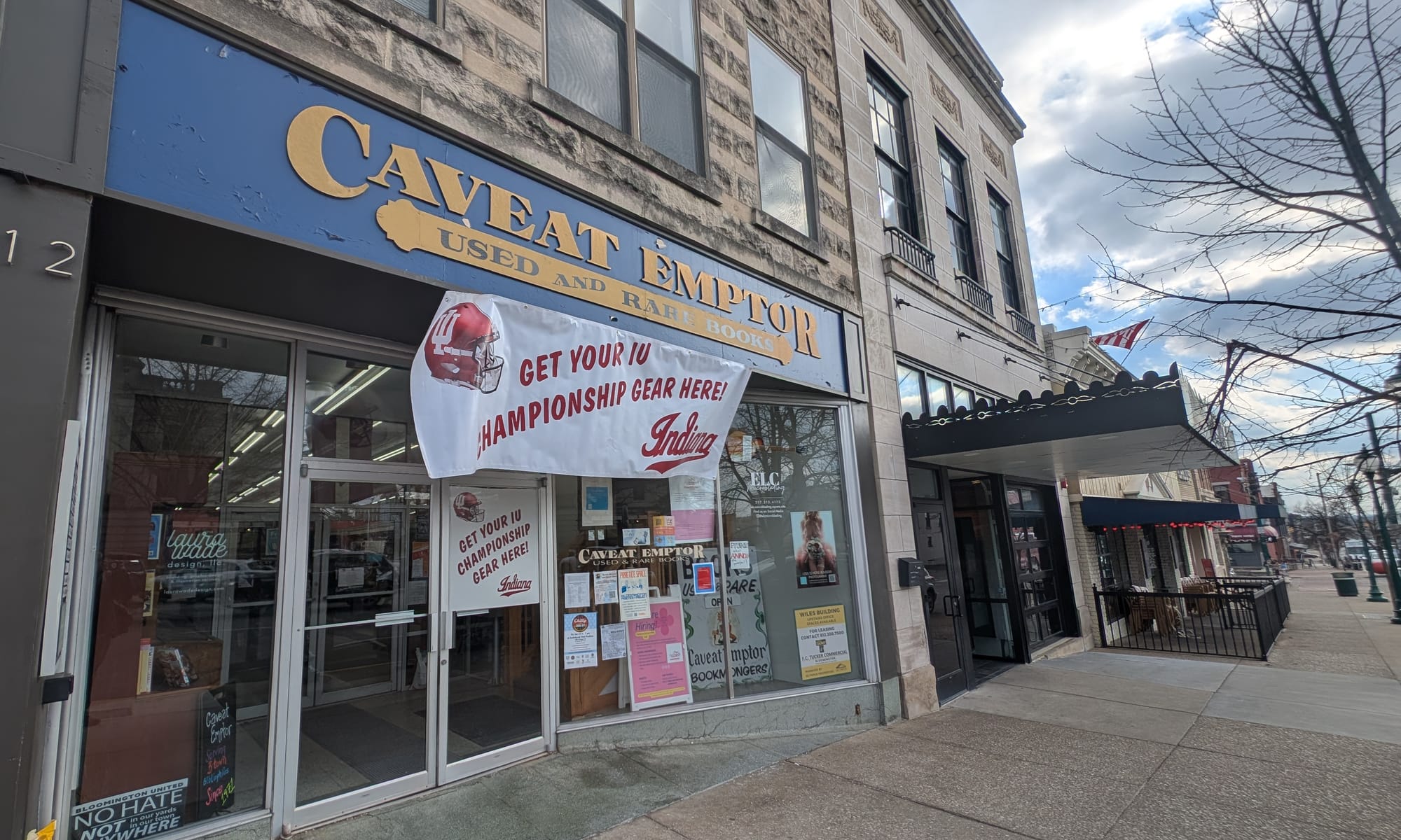 B There Courthouse square The banner hanging in front of Caveat Emptor says: “Get your IU championship gear here!” The banner hanging in front of Caveat Emptor says: “Get your IU championship gear here!” (Dave Askins, Jan. 22, 2026)