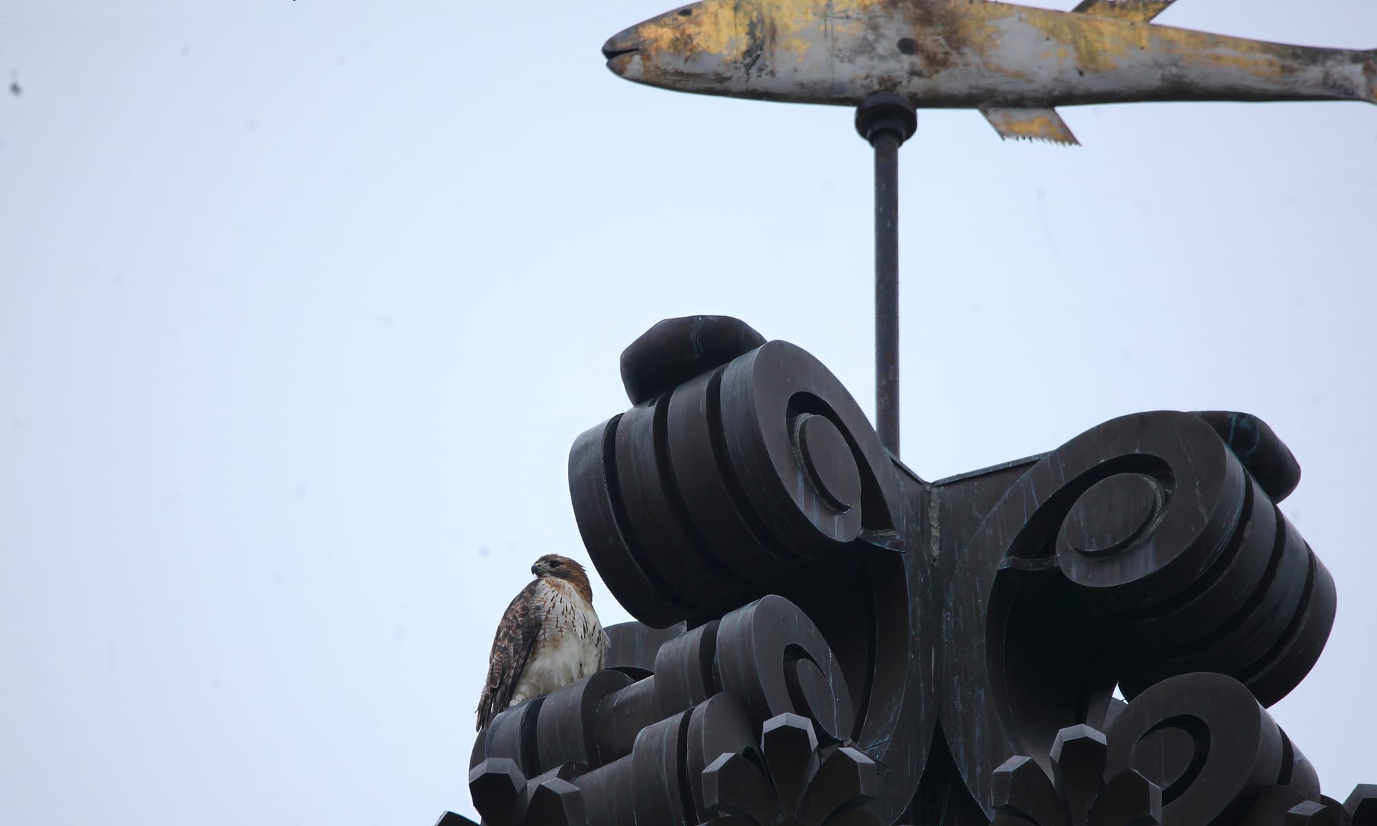 A red-tailed hawk sits under the fish-shaped weather vane on top of the historic county courthouse on a misty morning.