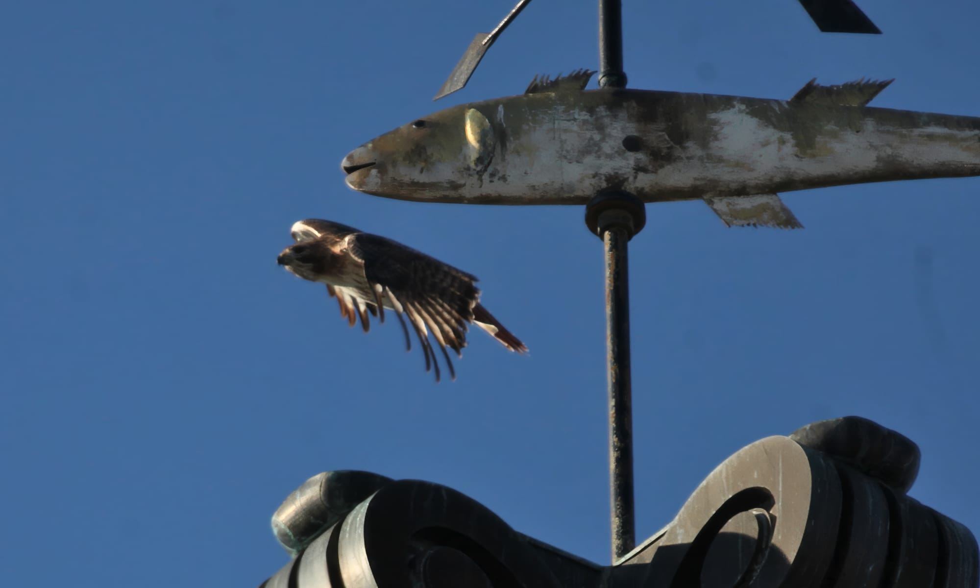 A red-tailed hawk lifts off from the top of the courthouse dome just under the weathervane fish. It’s worth noting that the fish rotates to point its nose to the wind. The hawk is launching itself into the wind.