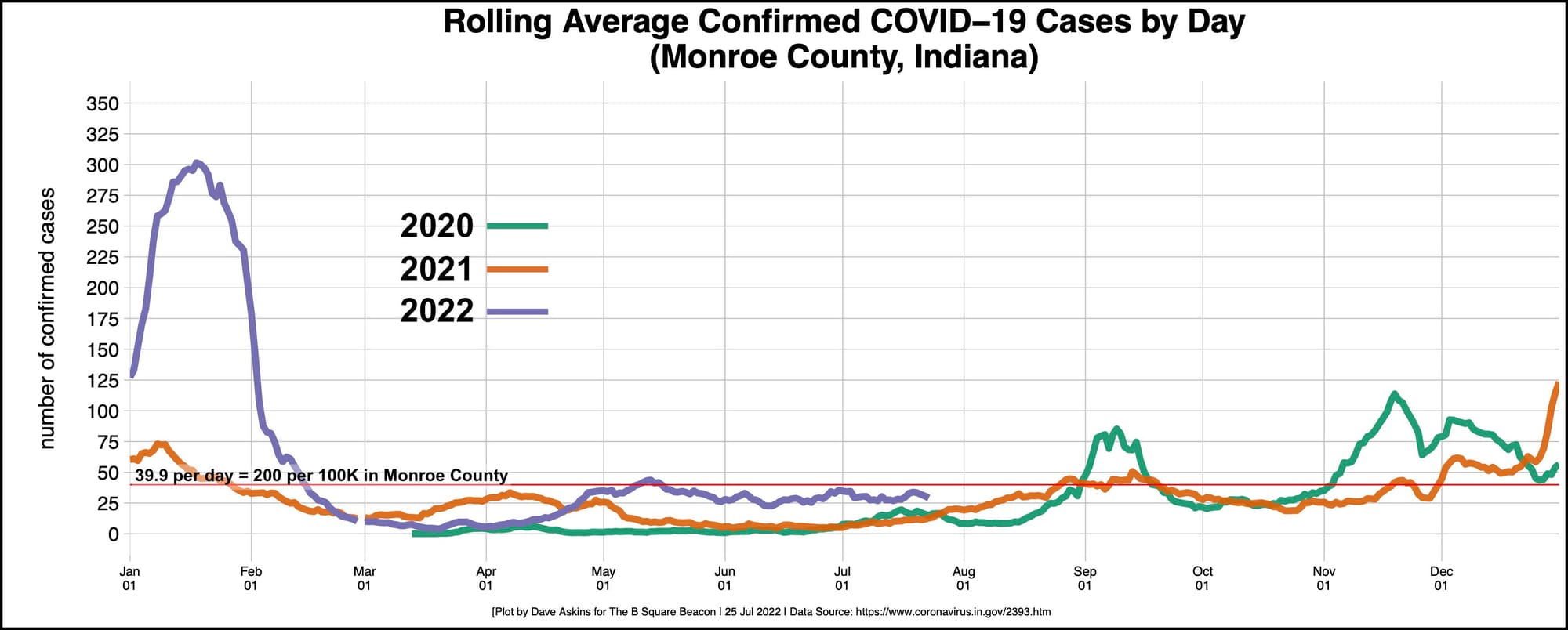 The 200 per 100,000 population benchmark translates to a rolling average of about 39.9 cases per day for Monroe County. For the last three months, the county has been oscillating between about 25 and 40 cases a day.