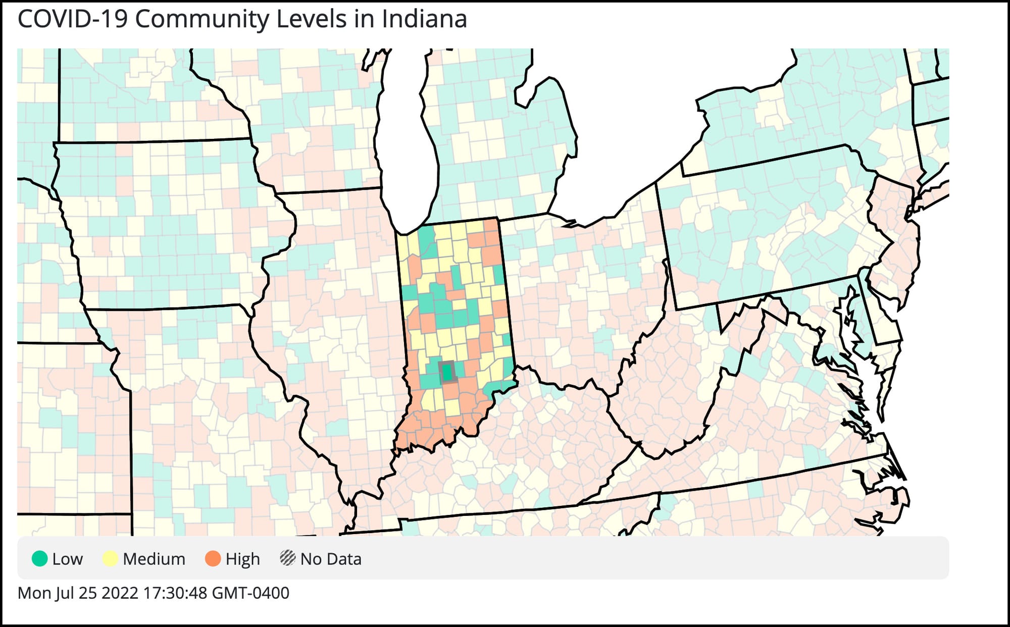 Of Indiana’s 92 counties, 39 have a “medium” community level and the remaining 34 counties have a “high” community level, according to CDC numbers.