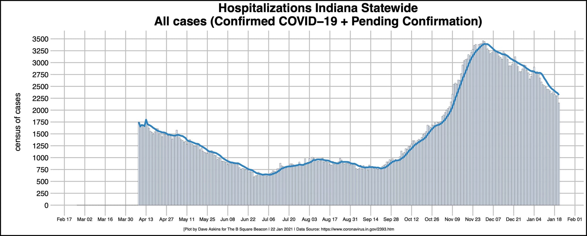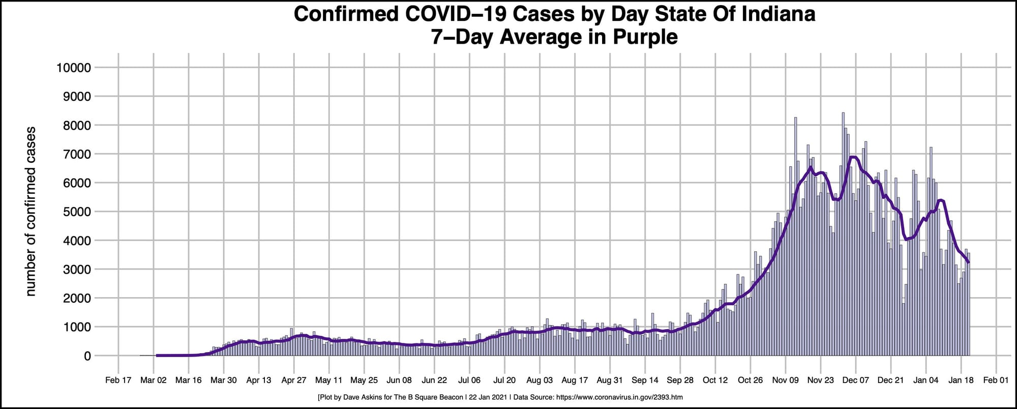 Across the state of Indiana, the rolling average of cases is down to around 3,200 after hitting a relative high around 5,400 in the first week of December.