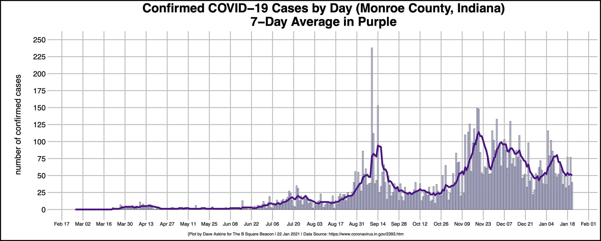 In Monroe County the rolling average of confirmed cases is now around 50, after hitting a relative high of 80 in the second week of January.