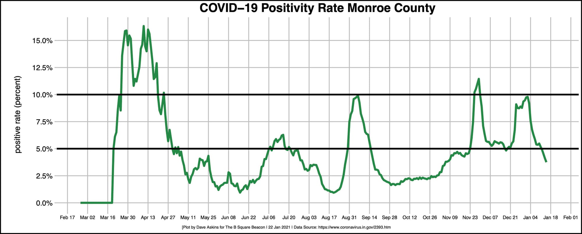 Monroe County’s rolling average positivity rate (all tests) is now down to 3.8 percent, after hitting a relative recent high of around 10 percent. The statewide positivity rate is now down to 10 percent, after starting the year around 16 percent.