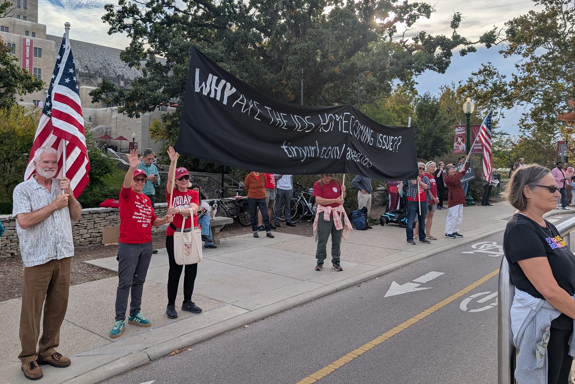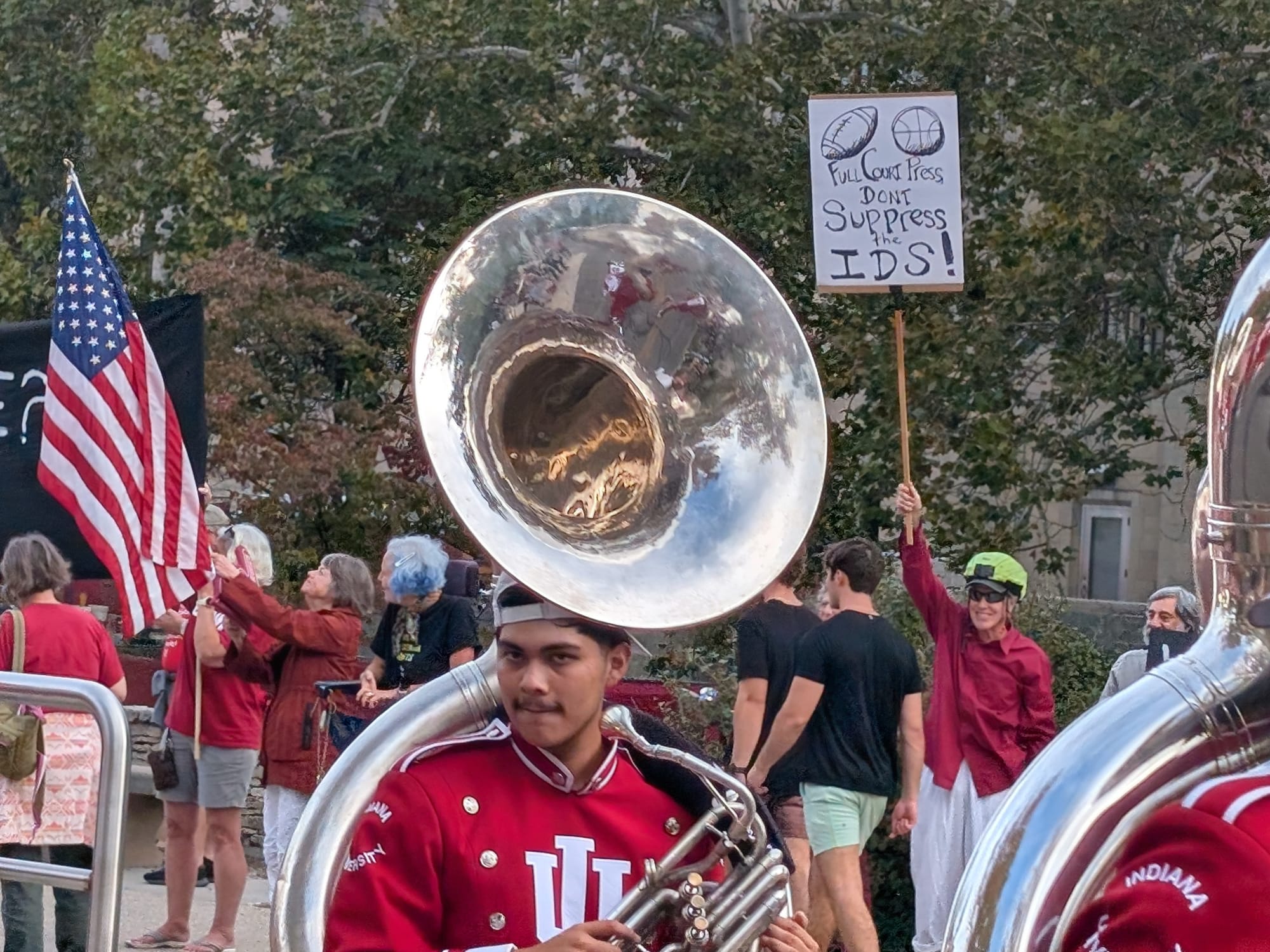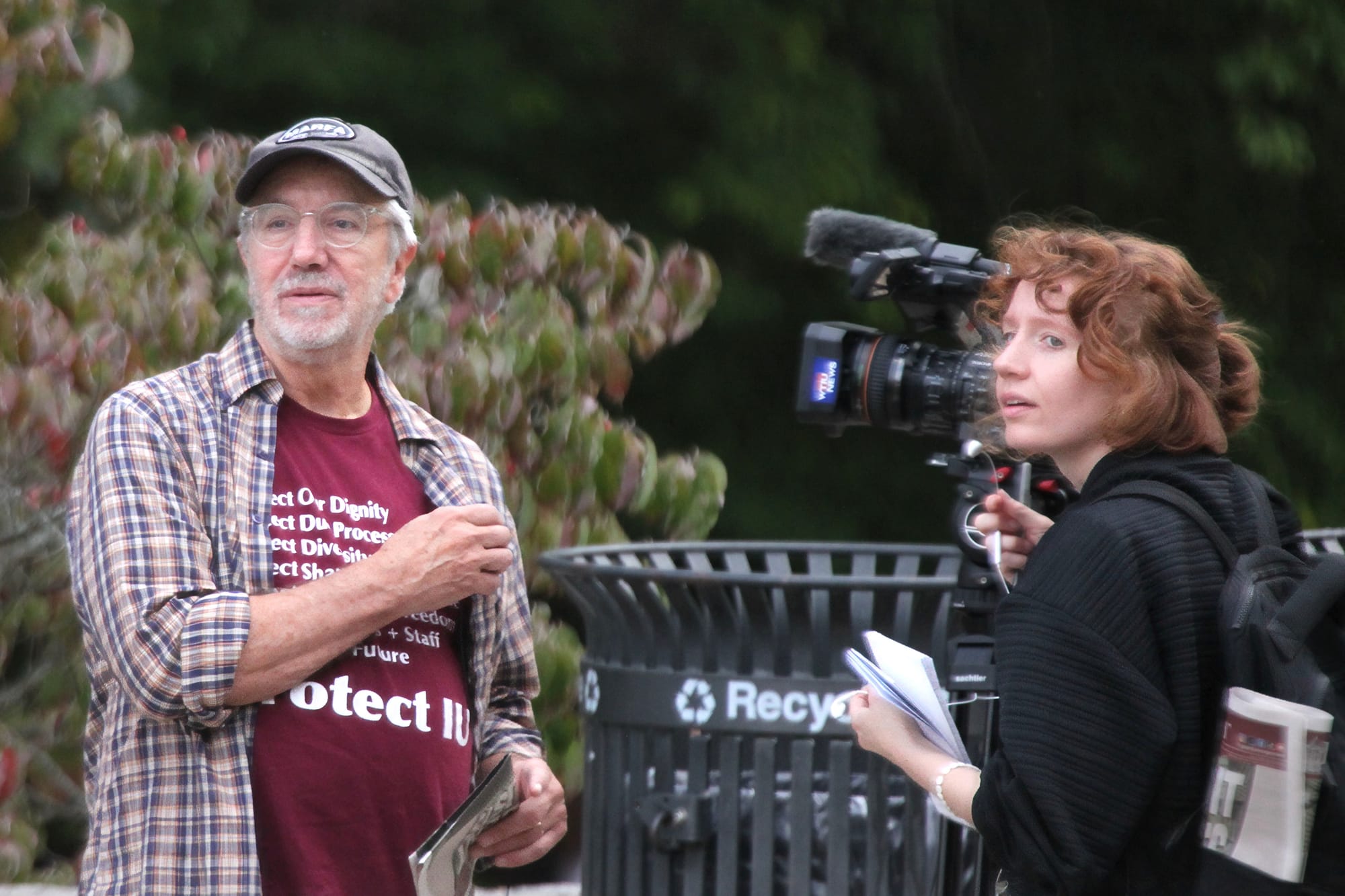 Among the Bloomington demonstrators was IU emeritus professor Russ Skiba, who has been active in opposition to university policies on expressive activities adopted after last spring’s Dunn Meadow protests. Skiba is also a plaintiff in a lawsuit challenging the exclusion of retired faculty from faculty governance.