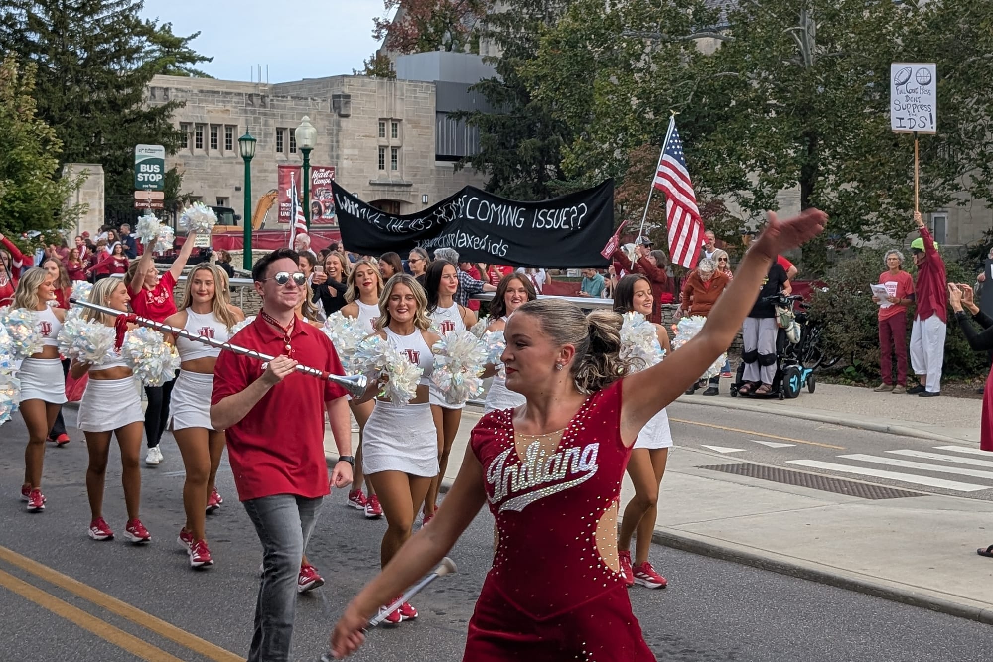 Left: Demonstrators hold a banner that says: “Why axe the IDS homecoming issue?” Right: IU cheerleaders march past the demonstrators. (Dave Askins, Oct. 17, 2025)