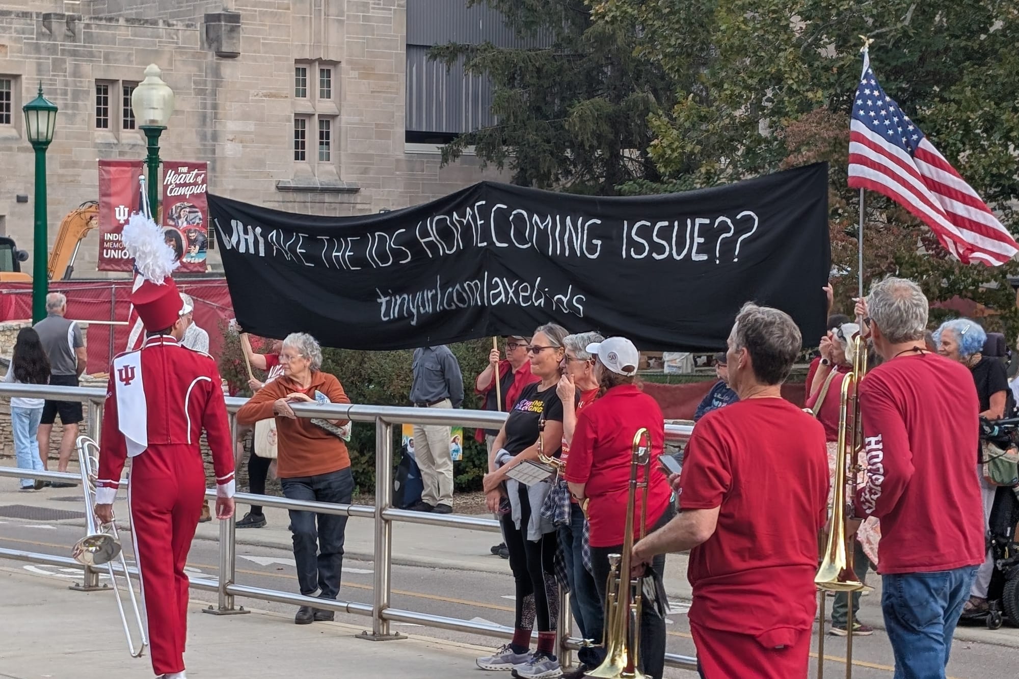 As parade entries rounded the corner onto 7th Street, they could see and hear about two dozen demonstrators who were gathered to show support for the Indiana Daily Student (IDS). The group, organized in part by former IU employee Peg Hausman, included current and retired IU faculty members.