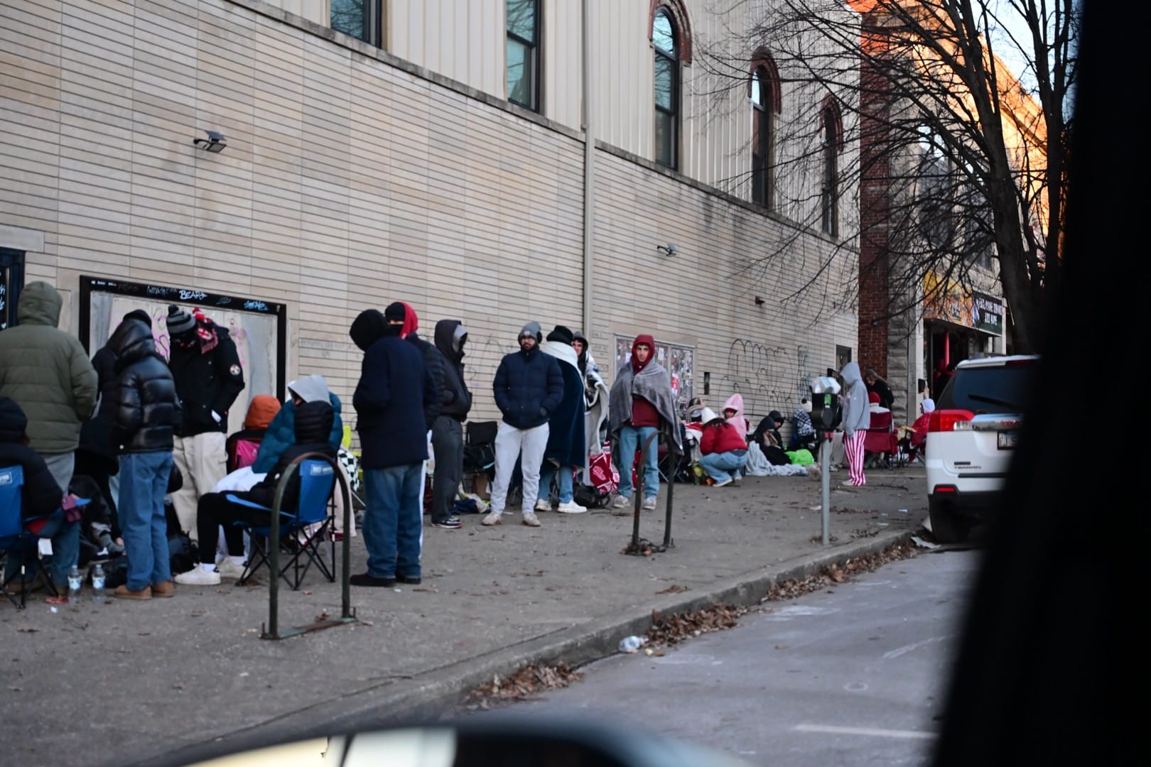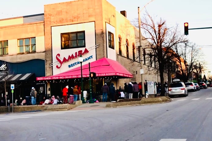 Around 9 a.m. on Monday (Jan. 19) the normally empty sidewalk from 6th Street along Walnut north up to Brothers Bar & Grill was packed with people huddled under heavy coats and blankets against the 11F° temperature, camped out waiting for 11 a.m. when the bar opens.