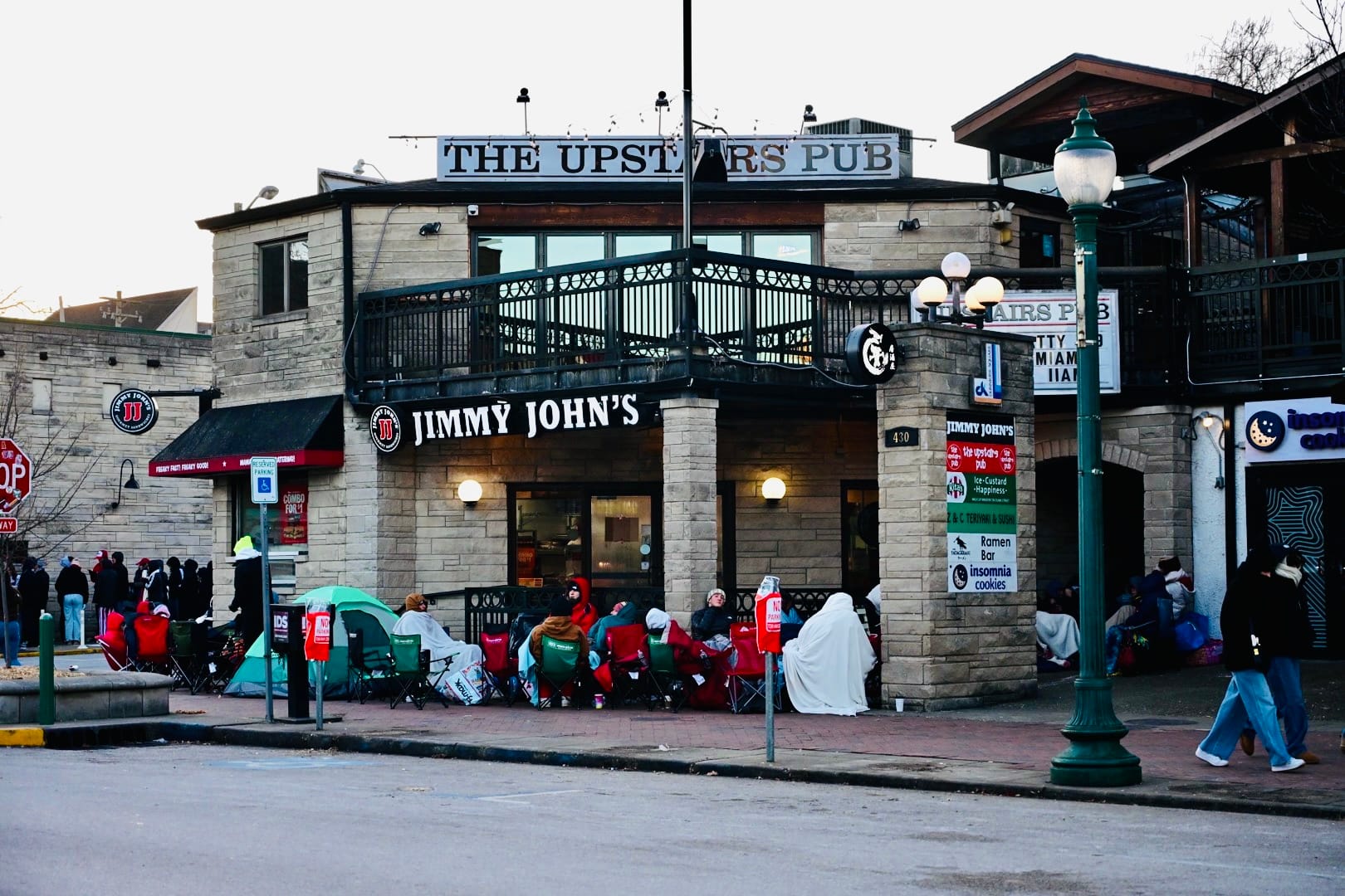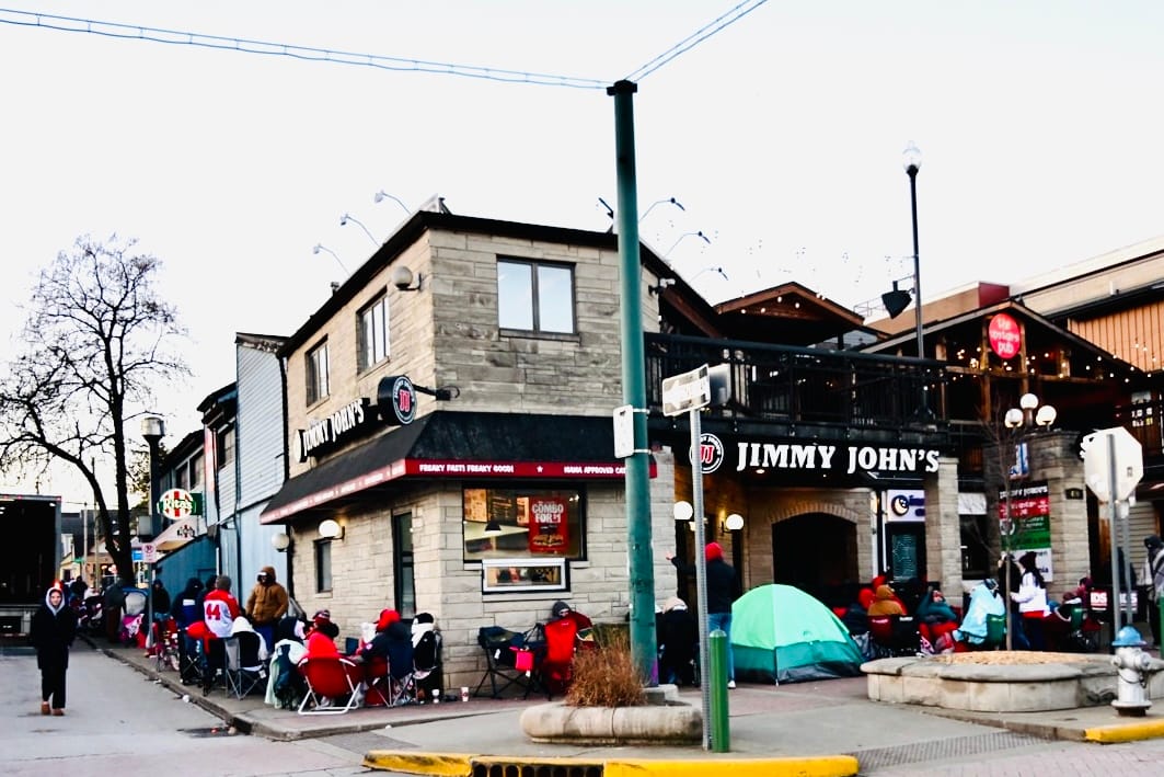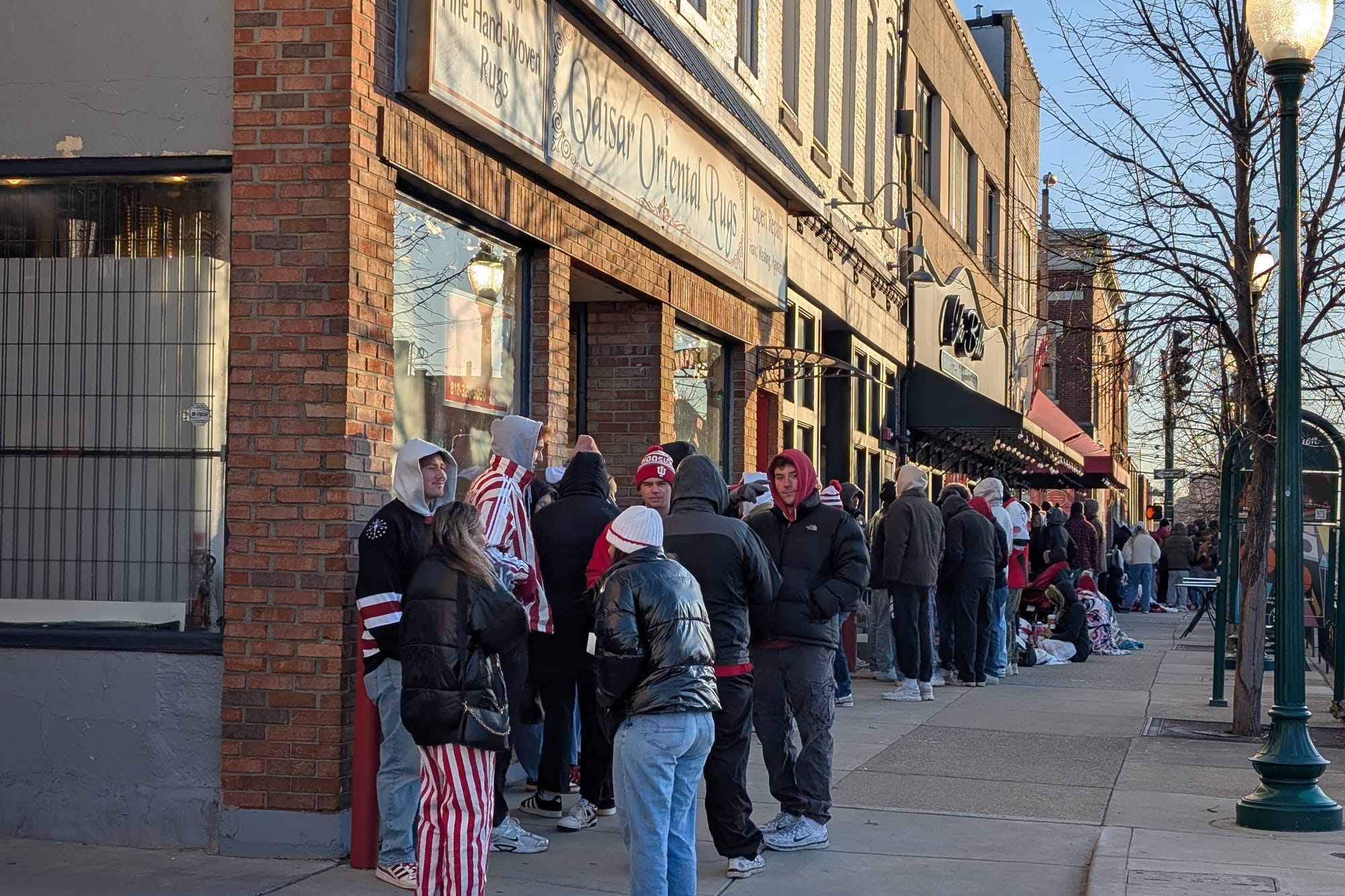 Downtown Bloomington sidewalks filled Monday morning as IU fans bundled against 11°F temperatures, camping outside Brothers, Nick’s, Kilroy’s and other bars for seats to watch IU vs. Miami for the national title. Some arrived Sunday night. Buskirk-Chumley is an overflow option.
