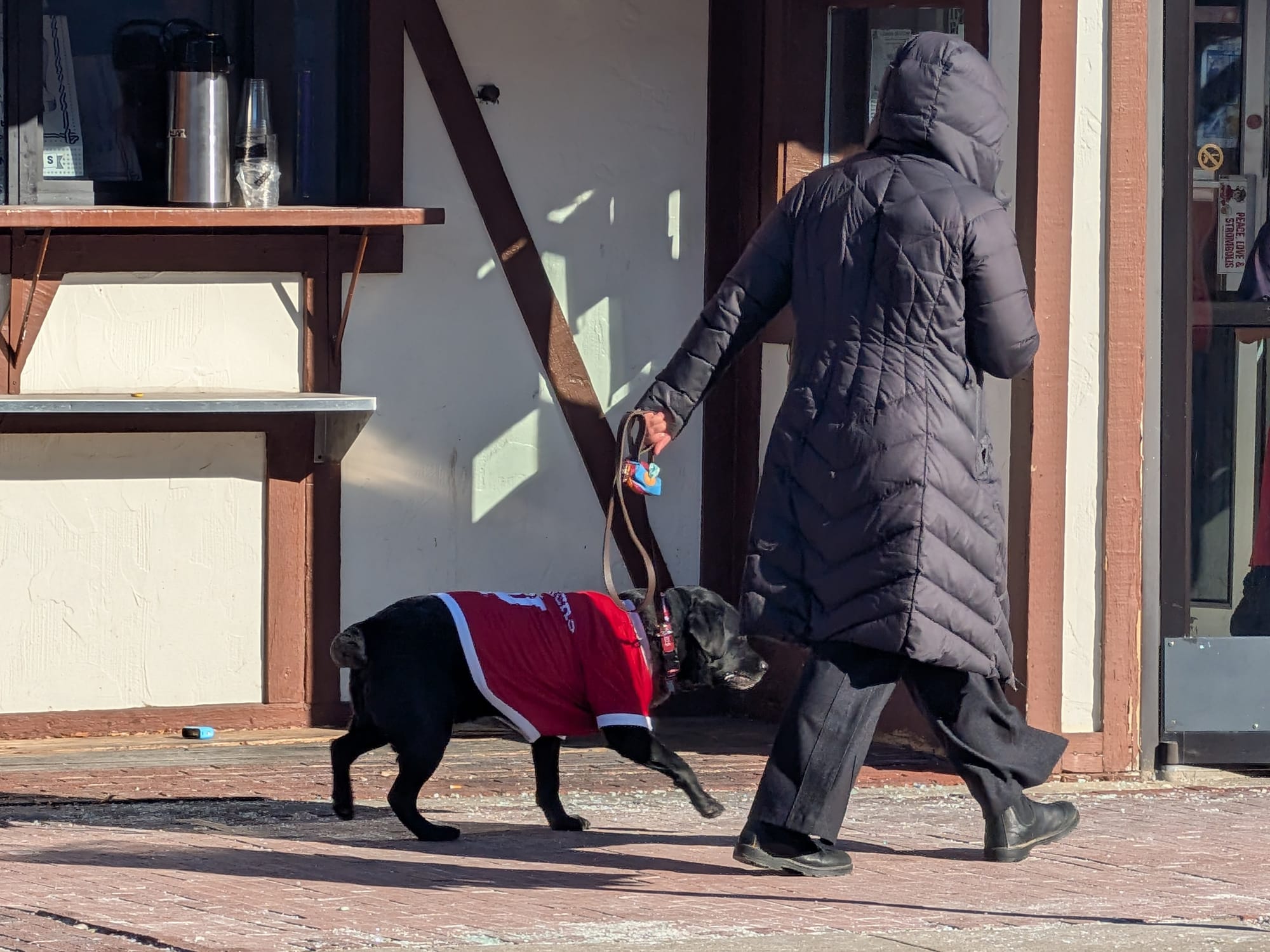 Left: Line to get into Nick's. Right: A woman leads a black Labrador retriever dressed in IU gear. (It's Kerry Thomson, mayor of Bloomington.) (Dave Askins, Jan. 19, 2026)