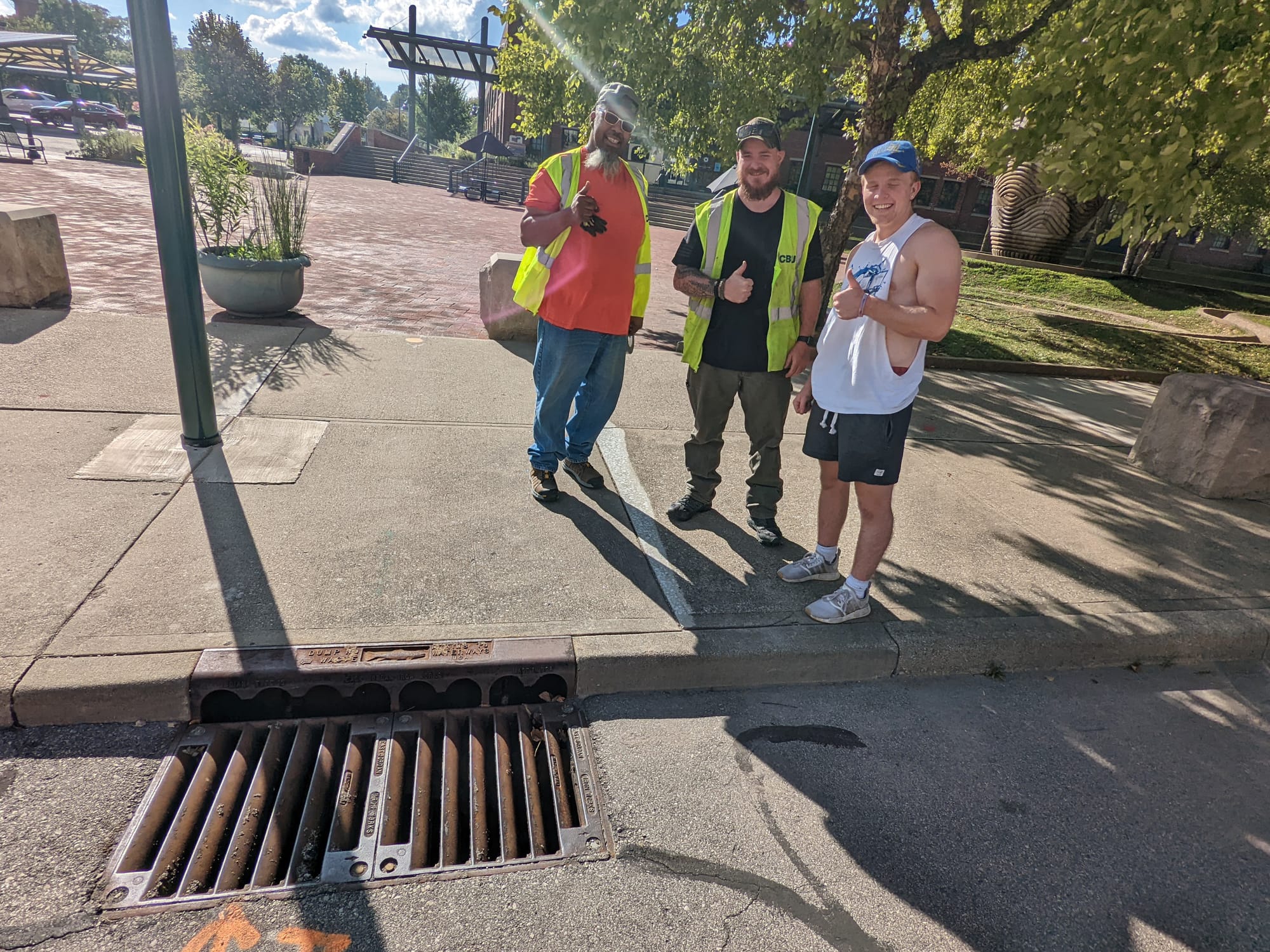 Standing on either side of him were two yellow-vested city of Bloomington utilities (CBU) workers—Robert Jackson and Matthew Dunn. Fritz’s face was pressed right up against the grate of a storm drain.