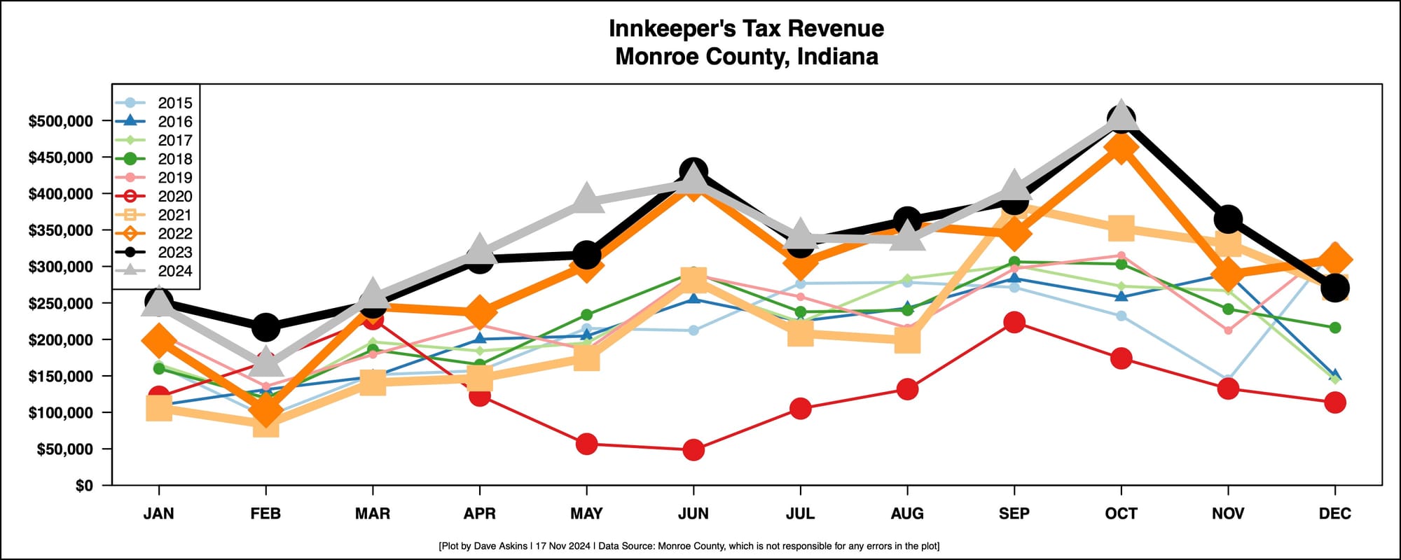 Also expected to get at least a mention is the revenue report for the last couple months from the innkeeper’s tax. The year-to-date numbers are a smidgen better this year than last year: $3,370,630.10 in 2024 compared to $3,357,033.68 in 2023. But at less than a half percent increase, that’s basically flat.