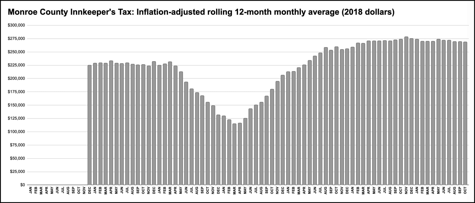 After recovering, following the COVID-19 pandemic to higher than pre-pandemic levels, inflation-adjusted numbers for innkeeper’s tax revenue have been pretty flat for about two years.