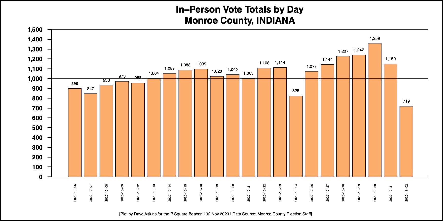 On the final day of early in-person voting, 719 people cast their ballots. That was a low for a daily total over the four week period, but that was because voting ended at noon. That meant just four hours of voting on Monday. Measured by through-put, the 180 voters per hour on Monday was the maximum achieved on any day during early voting.