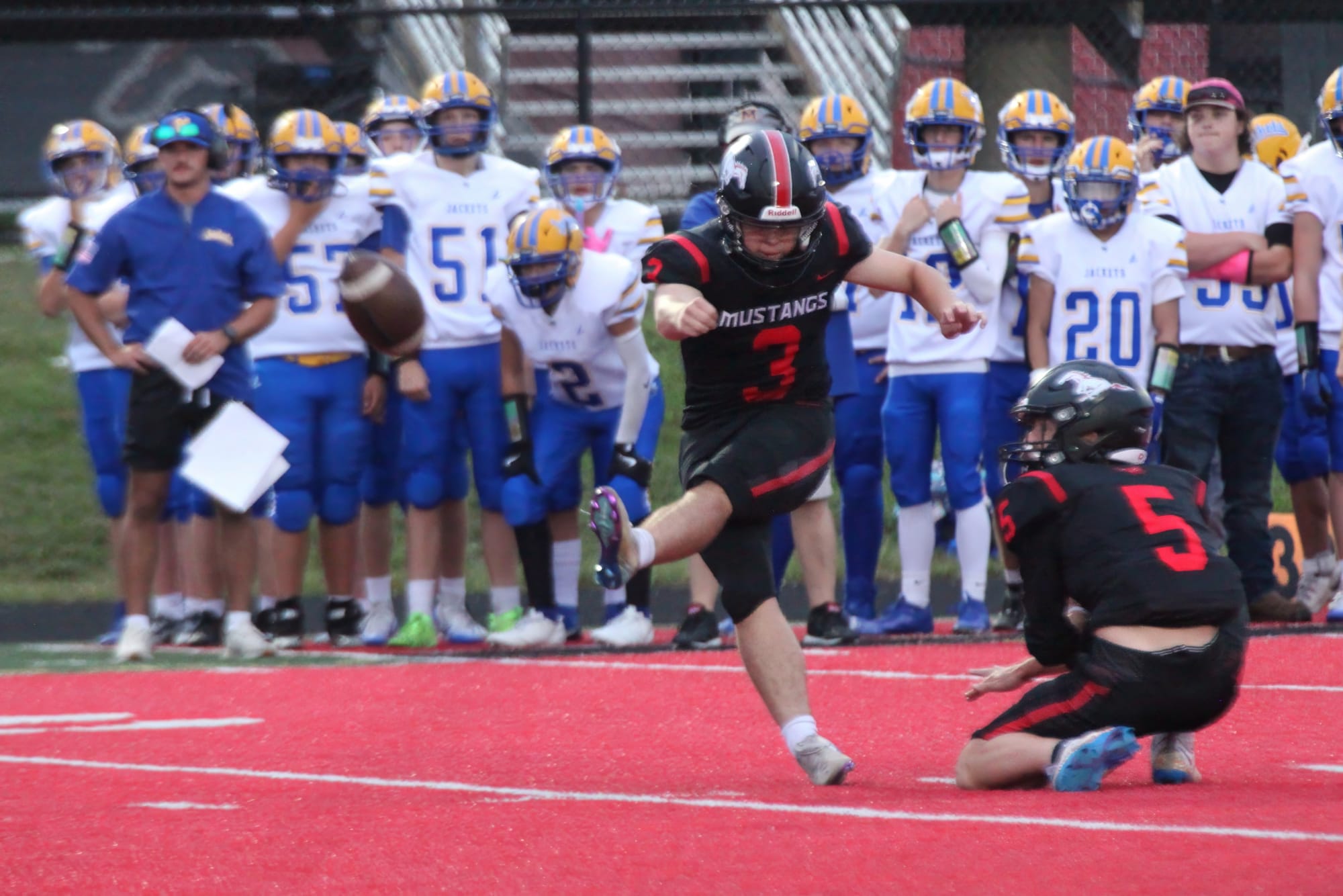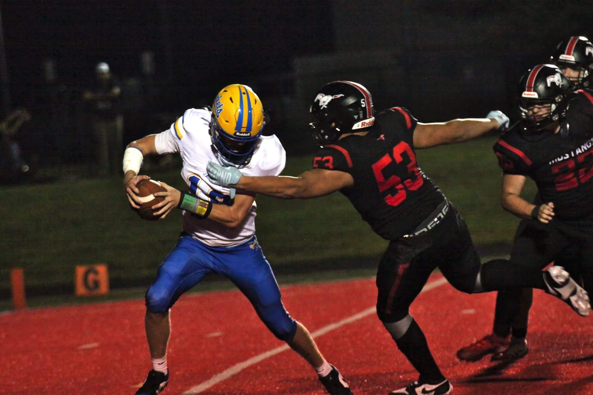 Later in the half, the Mustangs struck for one final score after starting a possession that the Mitchell 25—the result of a snap that went over the Mitchell punter’s head which he still managed to get away, just not very far. Michell’s punting duties are handled by running back Kaden Mullis, who looked comfortable tracking down the errant snap, eluding Mitchell defenders long enough to get his foot on the ball, even if it travelled only a short distance.