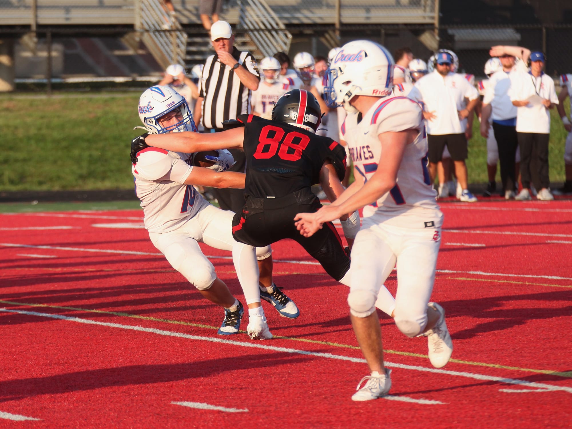 Mustangs linebacker Dylan Wickens (88) wraps up the Indian Creek ball carrier. (Dave Askins, Aug. 15, 2025)