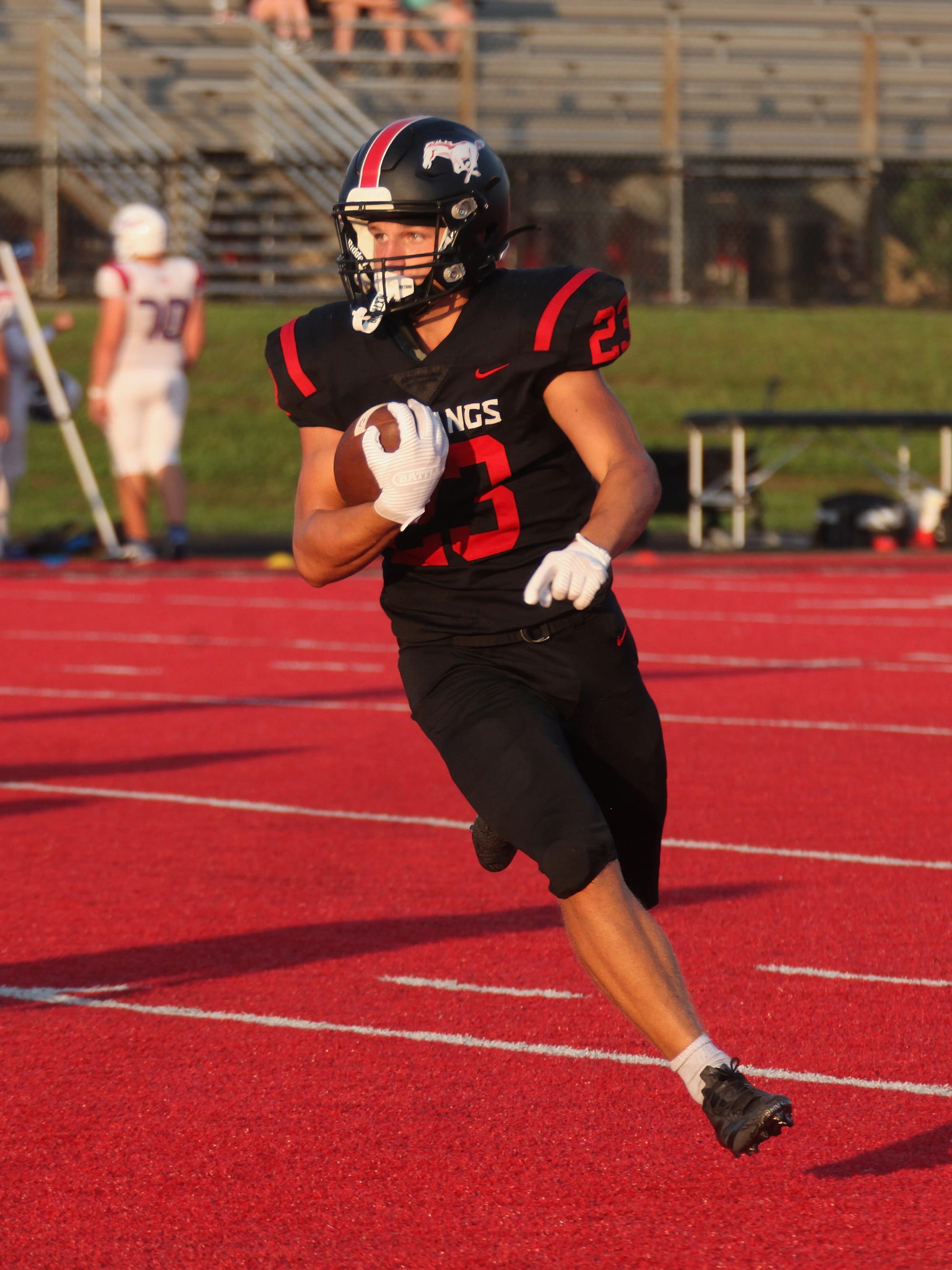 Mustangs running back Jack Grubaugh (29) scampers down the sideline. (Dave Askins, Aug. 15, 2025)