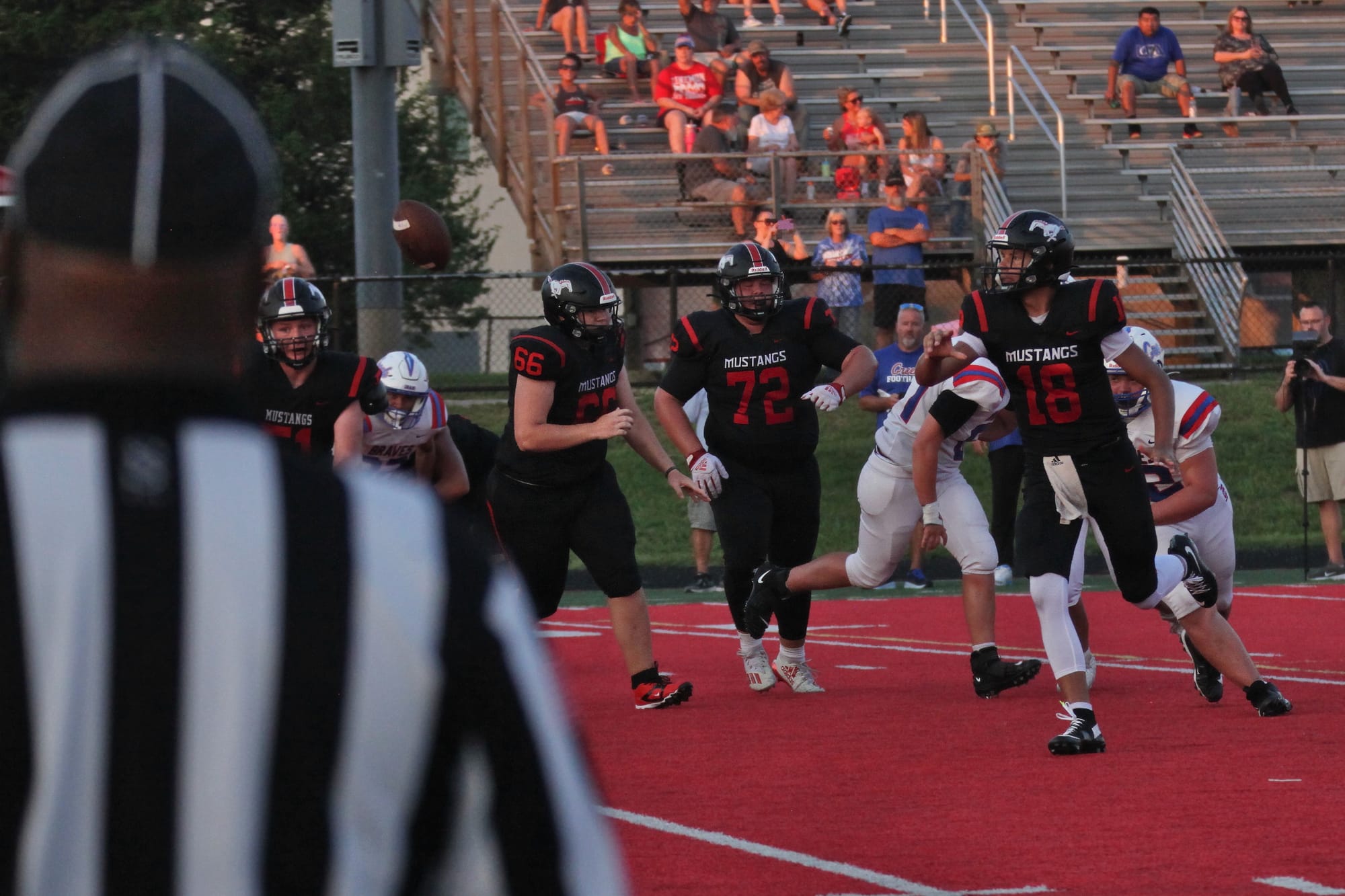 Mustangs QB Braylon Linerode (18) shovels the ball to Reece Roberts (4), and it goes for a touchdown. (Dave Askins, Aug. 15, 2025)