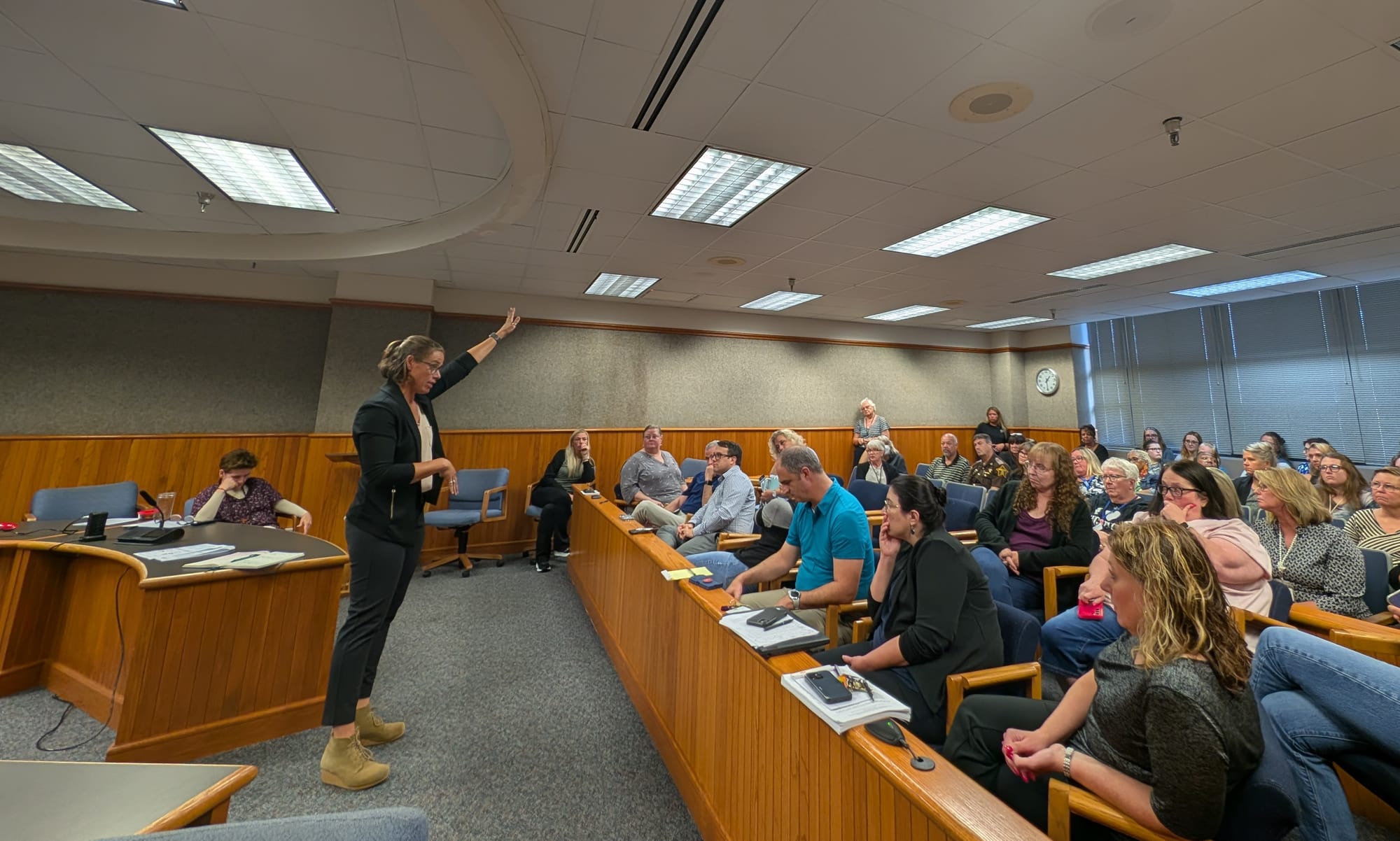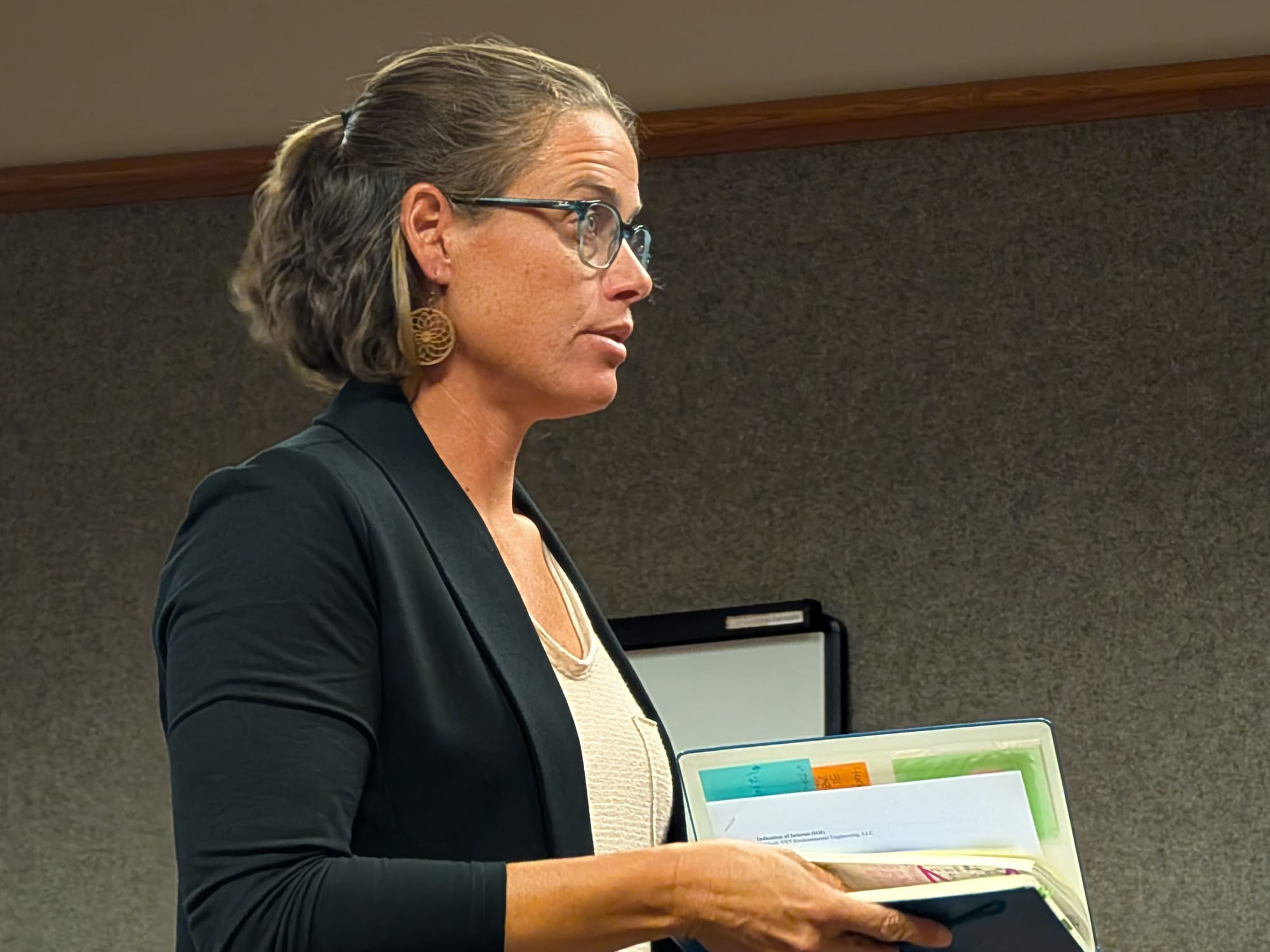 Top left: Angie Purdie, administrator for the county commissioners and Julie Thomas (wearing mask), county commissioner. Top right: County councilor Jennifer Crossley. Bottom: Sara Hamidovic, with VET Environmental Engineering, addresses a capacity crowd in Courtroom 313 at the Monroe County justice building. (Dave Askins, Aug. 21, 2025)