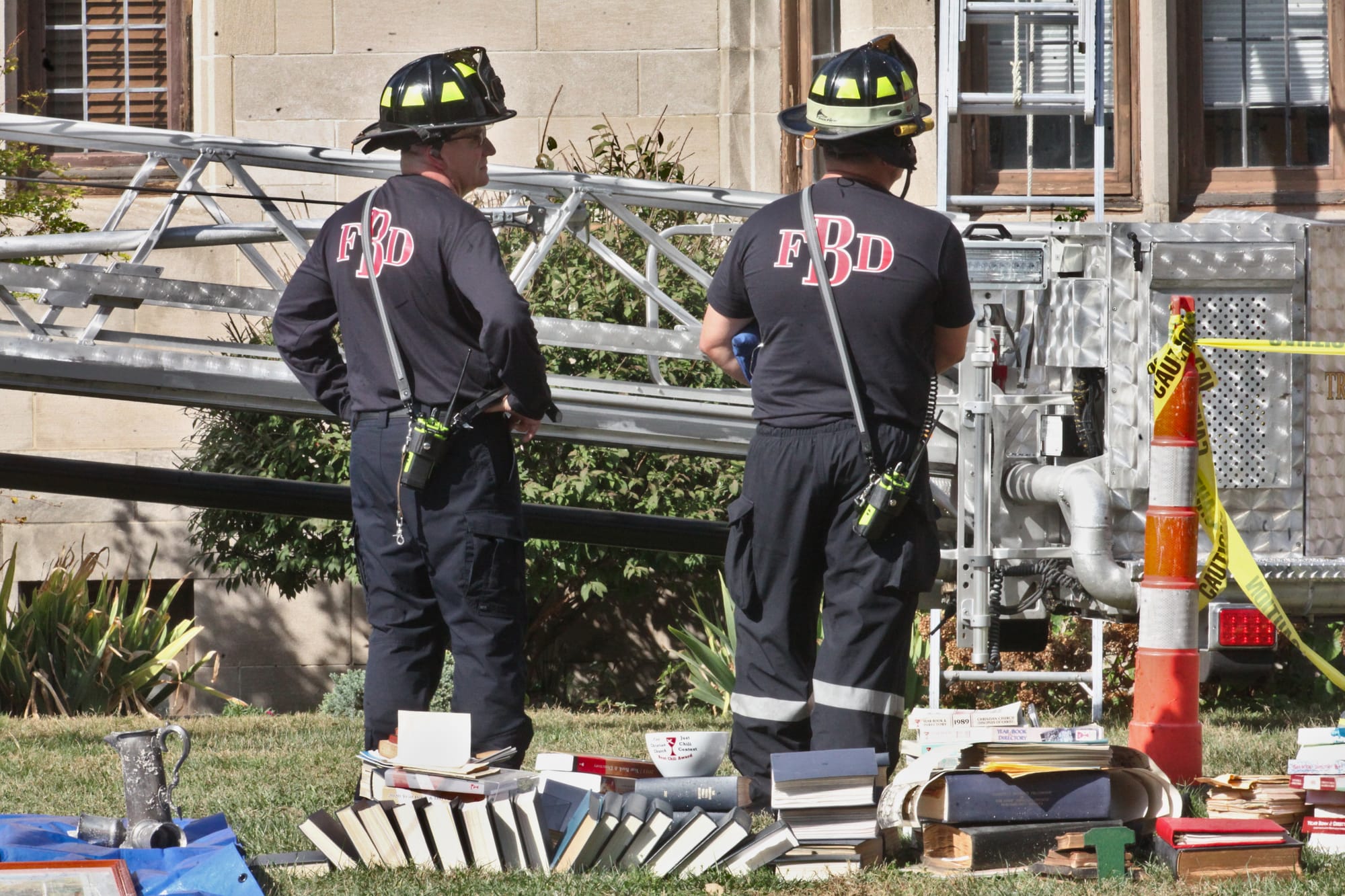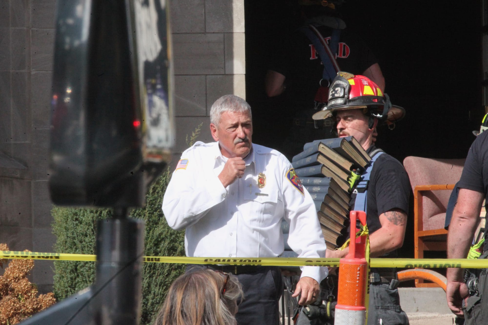After the fire was put out, firefighters entered the “salvage and overhaul” phase of the fire scene response after the basic work of putting out the fire. That activity included placing tarps over items inside the building to prevent further water and smoke damage, and carrying important contents—such as books and furniture—outside to protect them. “You salvage what property you can internally and externally,” Litwin said. He described a part of the overhaul process as checking for any fire hidden in walls, attics, or ceilings.