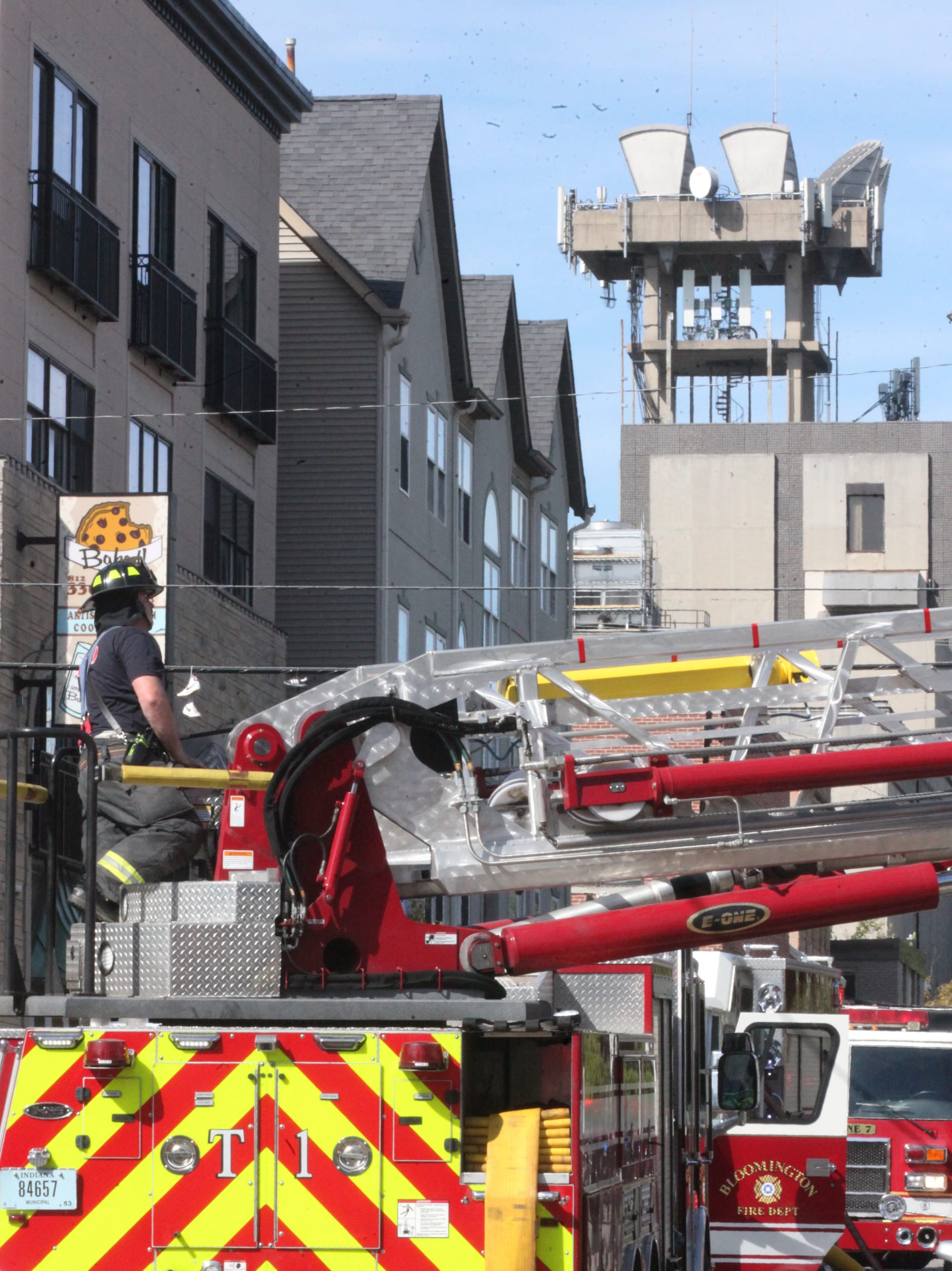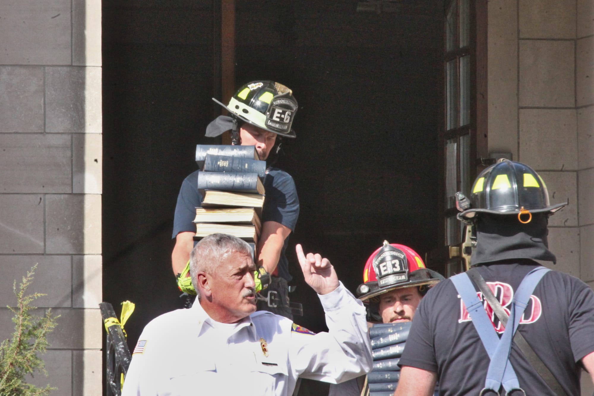 The very first note in the dispatch traffic on the incident was received at 3:06 p.m., according to deputy chief Max Litwin of the Bloomington Fire Department, who briefed press on the scene. Chief Roger Kerr was also on site. By around 3:20 p.m. the black smoke that was billowing from the roof was no longer visible.