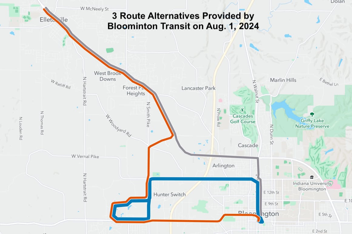 One of the other two route possibilities would offer service between downtown Bloomington and Ellettsville. The third possibility would combine Bloomington-to-Ellettsville service with a western loop that includes some area west of Bloomington.