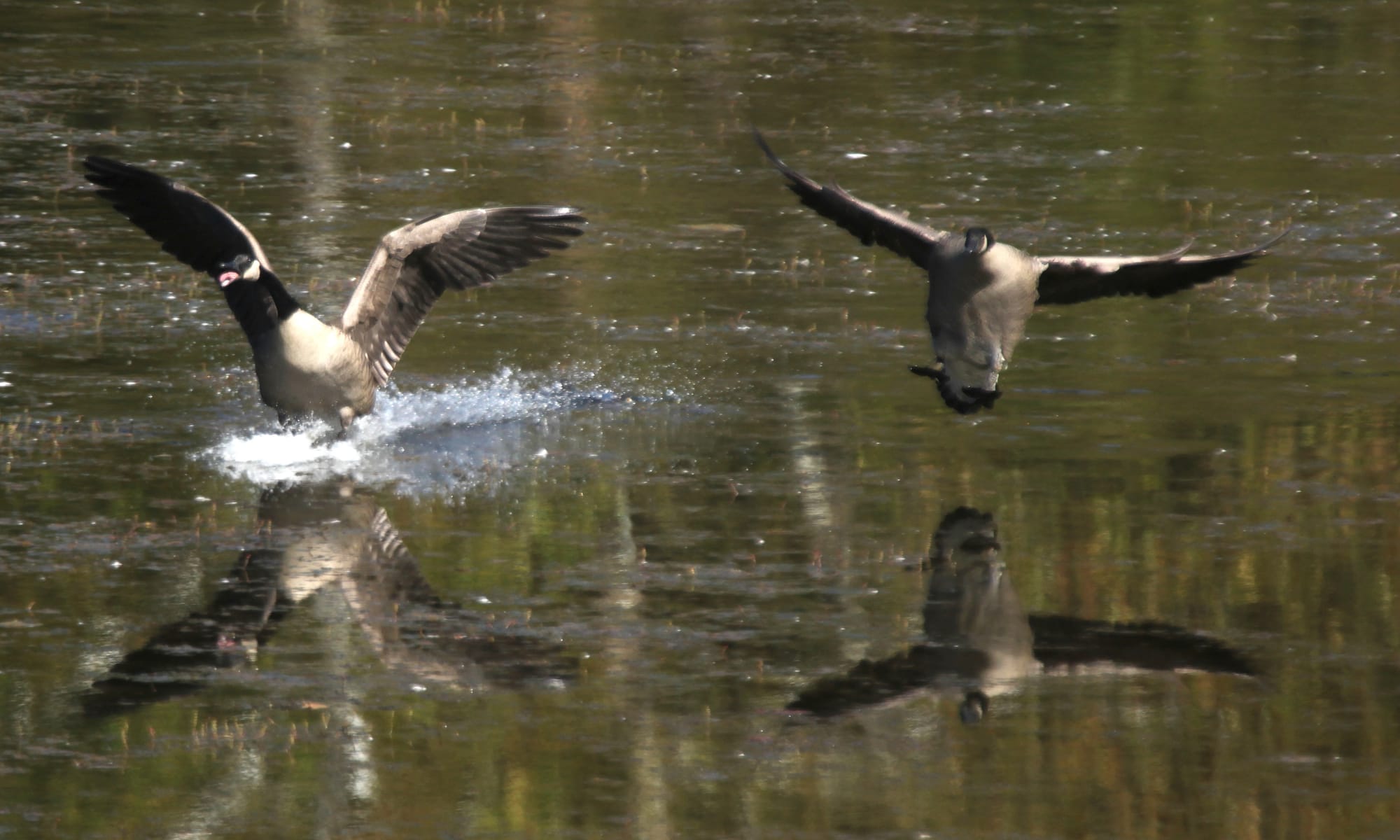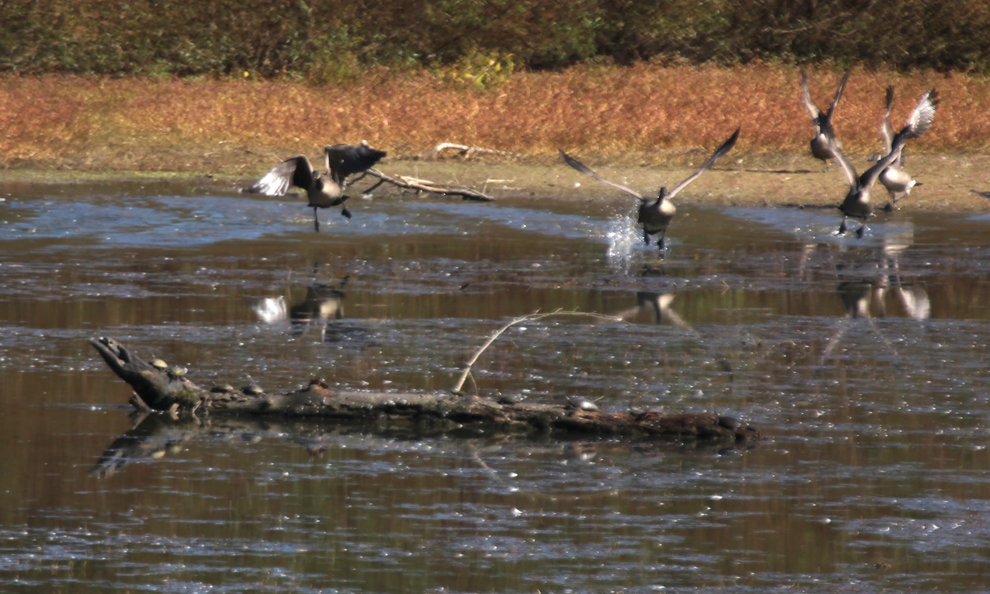 A flock of Canada geese taxi down a runway blocked with a log full of turtles, but manage to achieve clearance and land safely on the other side of the log. (Dave Askins, Oct. 12, 2025)
