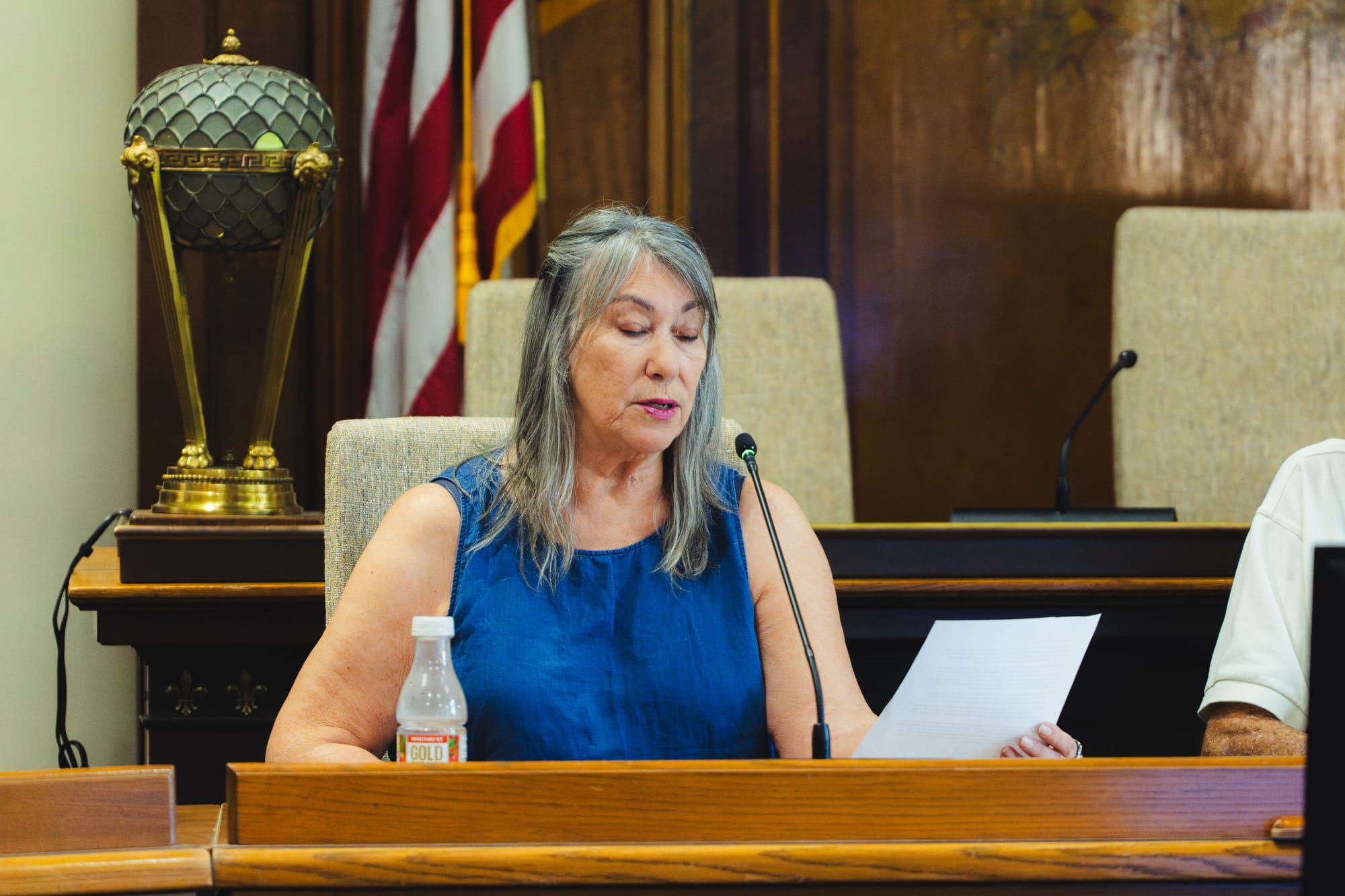 Left: Monroe County health board chair Dawne (Aurora) DiOrio reads a statement at the beginning of Monday's meeting. Right: One public comment is heard, from a person on Microsoft Teams identified as Ernie Frazo. (Kelton O'Connell, July 14, 2025)