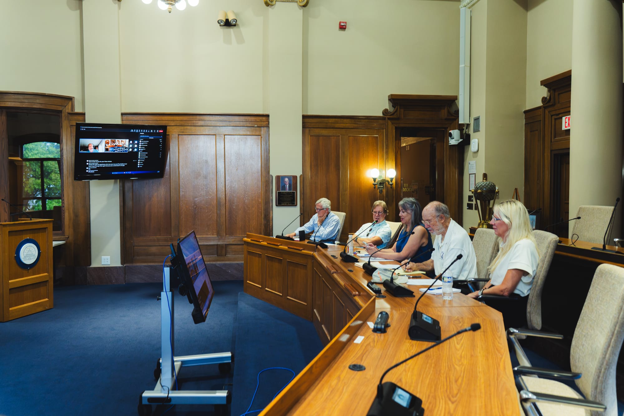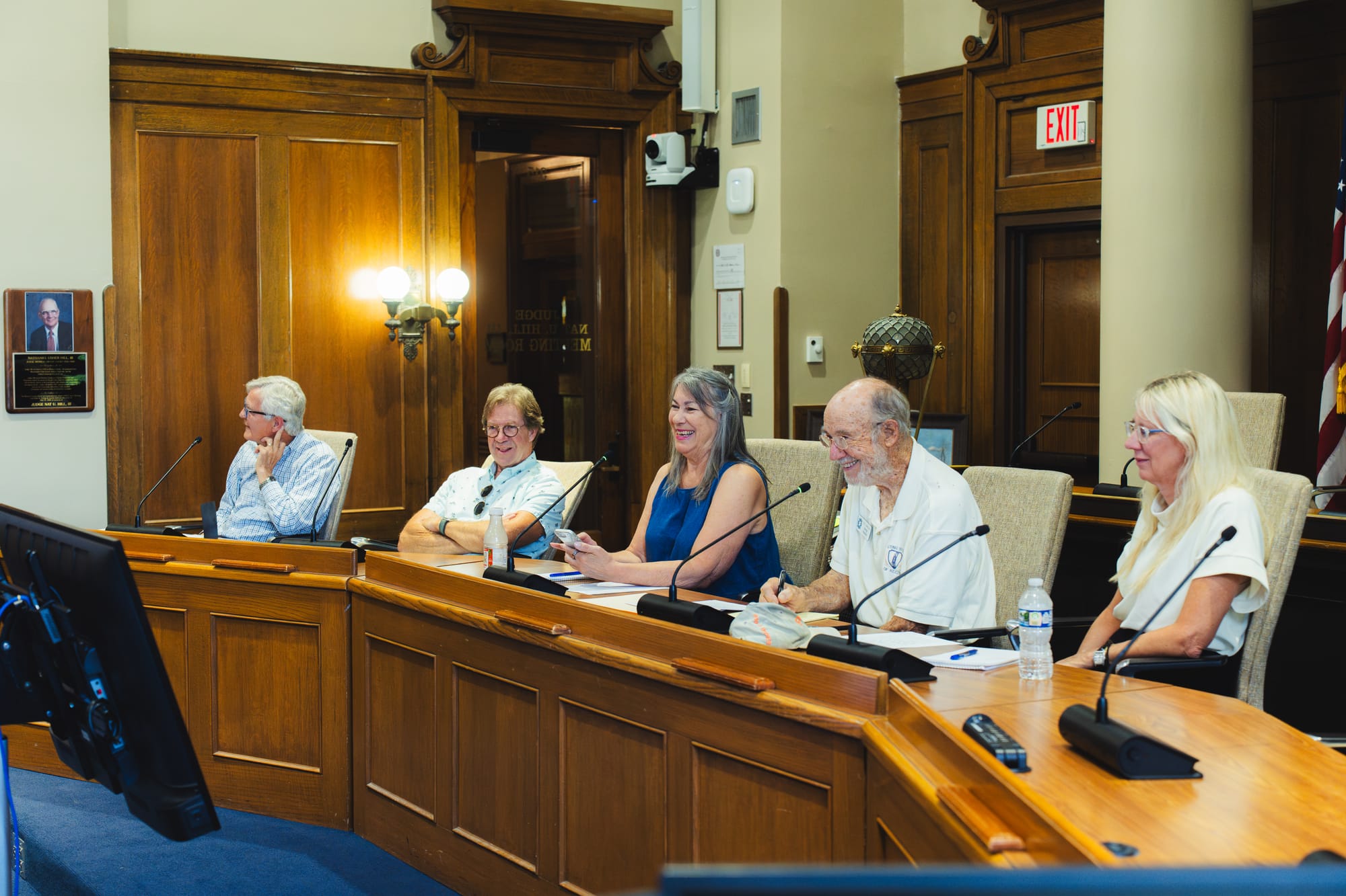 Monroe County health board members public comment during Monday’s meeting. From left: Lee McKinley, Stephen Pritchard, Dawne (Aurora) DiOrio, George Hegeman, and Lisa Hanner-Robinson. (Kelton O'Connell, July 14, 2025)