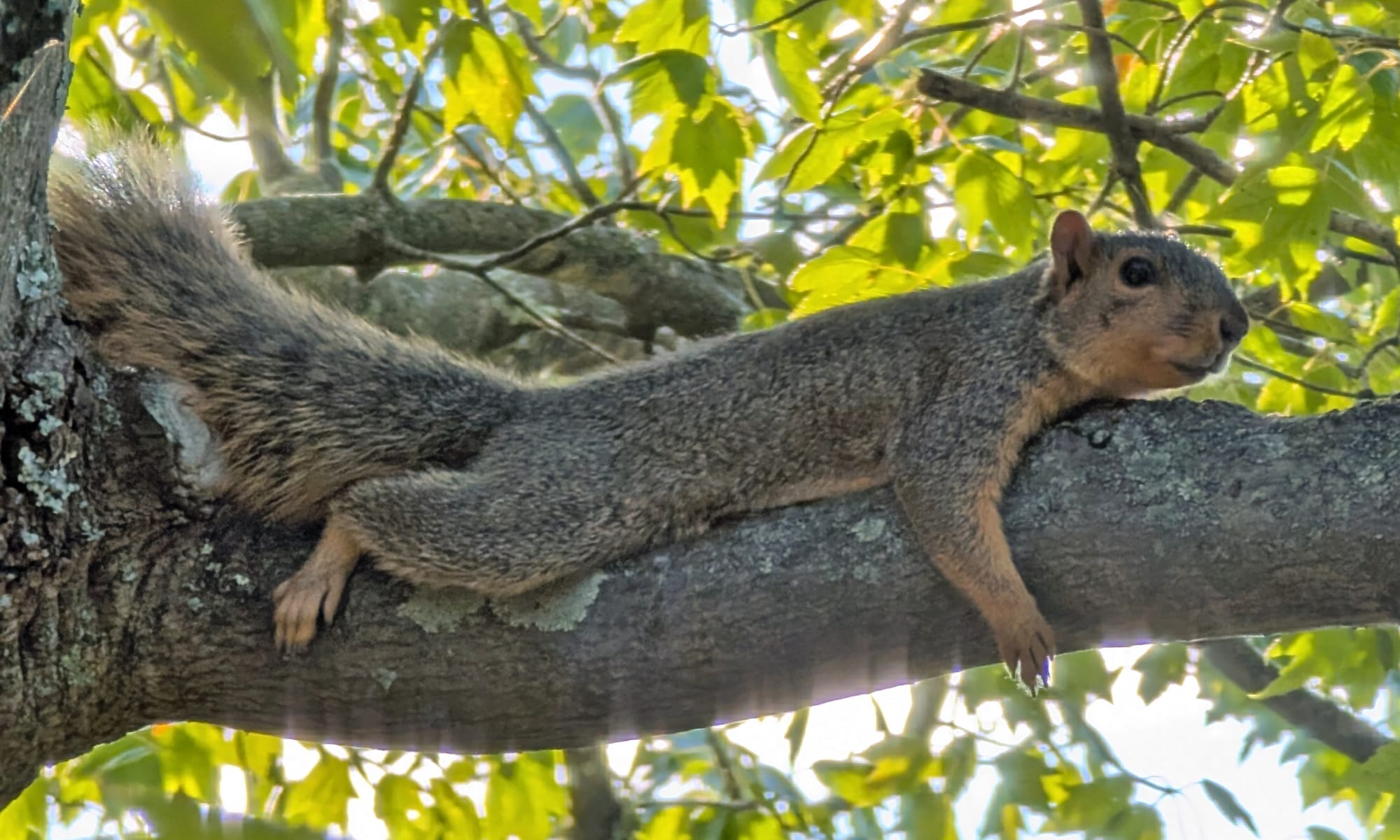B There Indiana Avenue & Kirkwood Avenue A squirrel planks a low branch on the Indiana University campus. A squirrel planks a low branch on the Indiana University campus. (Dave Askins, Oct. 4, 2025)