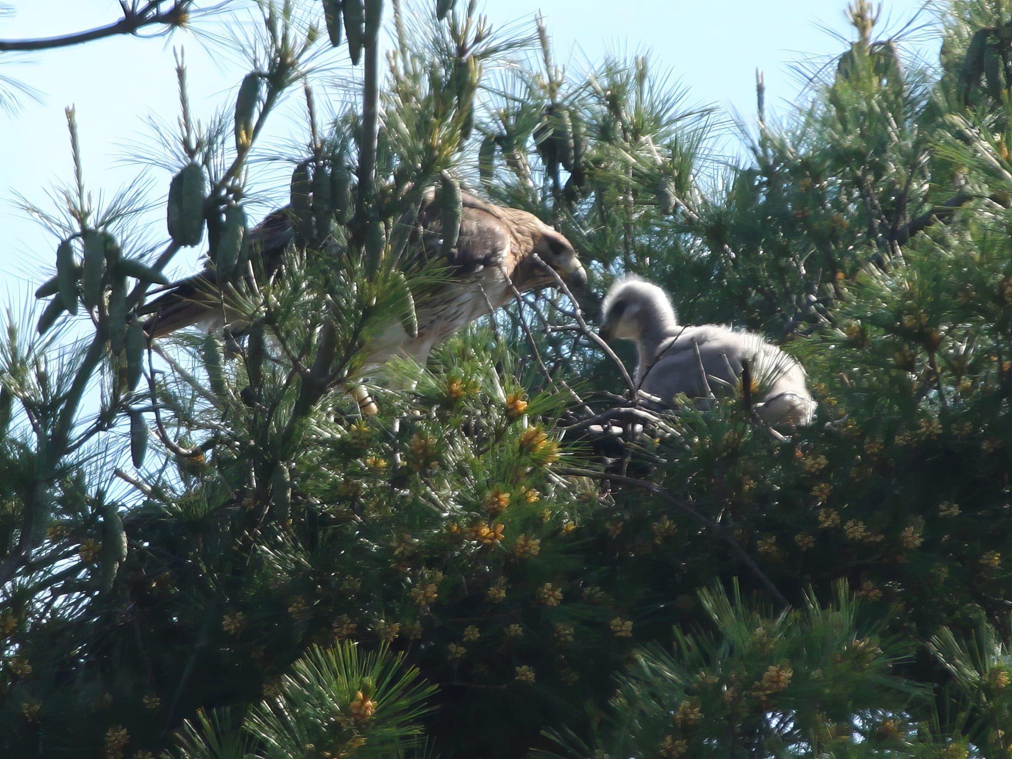 There's a red-tailed hawk's nest in the big pine tree on the northwest corner of the Monroe County courthouse lawn. The hatchlings are now hopping around, out of the nest, on the nearby branches. If you stand on the sidewalk in front of JL Waters, that's a good angle for watching them.