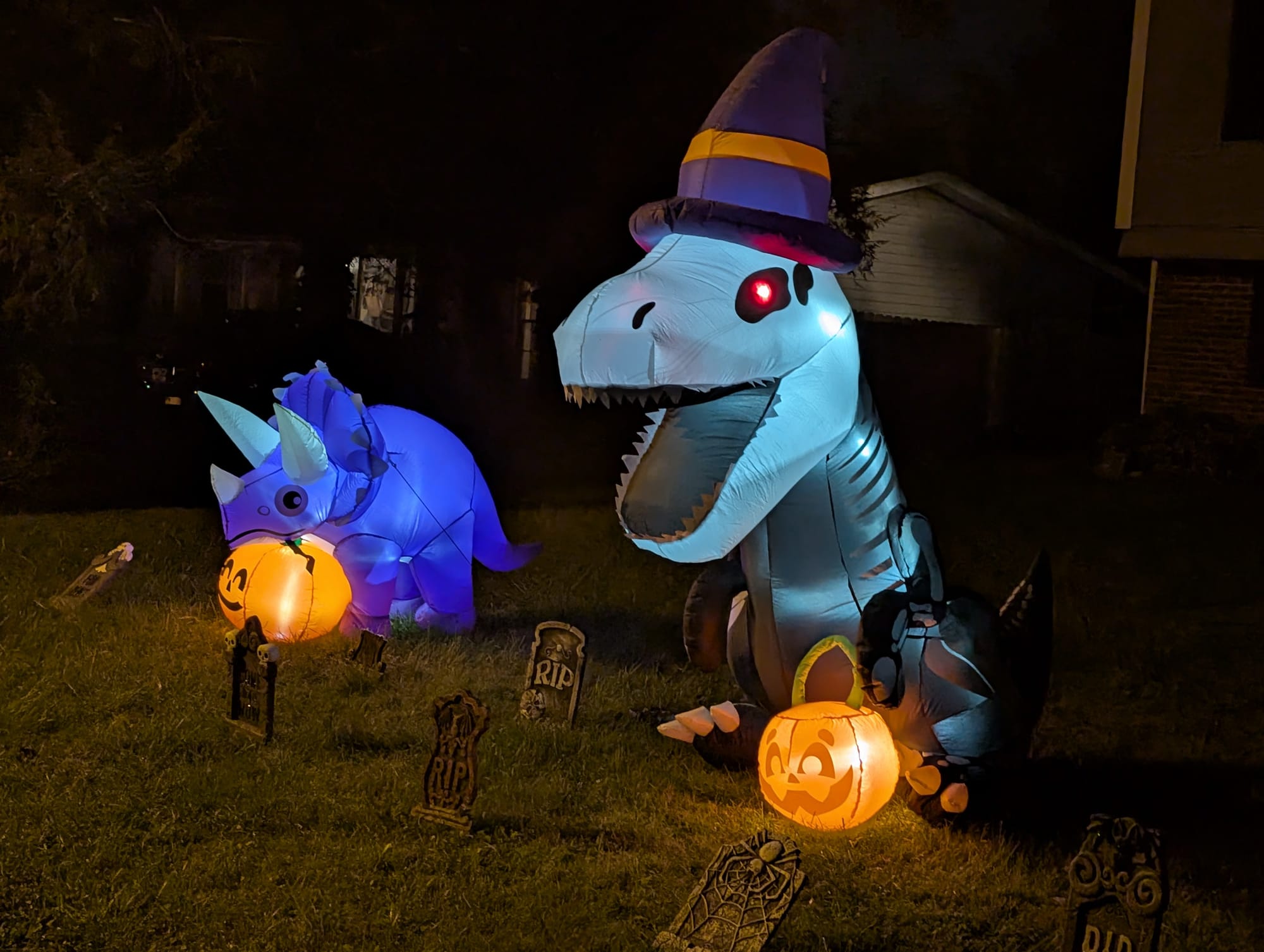 Inflatable dinosaurs (triceratops and tyrannosaurus rex) with lighted jack-o-lanterns on the lawn. If the people who visit this house on Halloween to do not say, “T-Rex or treat!” they are missing a great chance to be hilarious. (Dave Askins, Oct. 10, 2025)