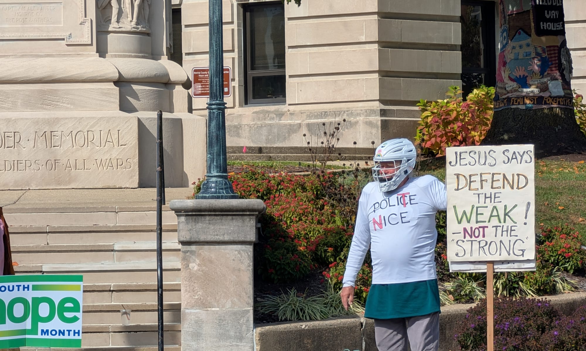 It’s common to see demonstrators on the southeast corner of the courthouse, but not very common to see someone on a Sunday afternoon. This man, wearing a hockey mask, is holding a sign that reads, “Jesus says defend the weak, not the strong.” (Dave Askins, Nov. 2, 2025)