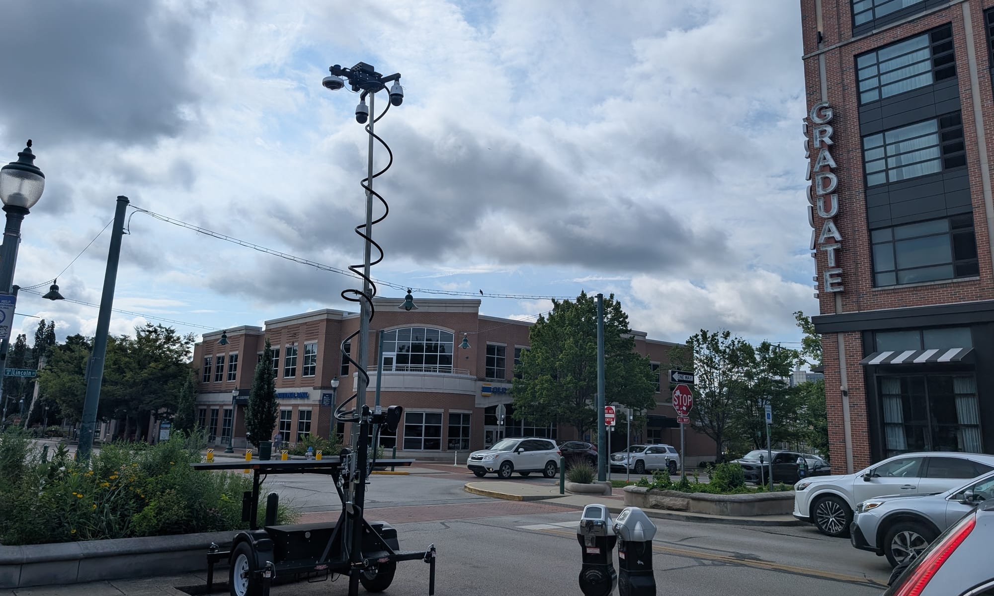 The mobile solar powered surveillance cameras have been set up by the Bloomington police department at this location.