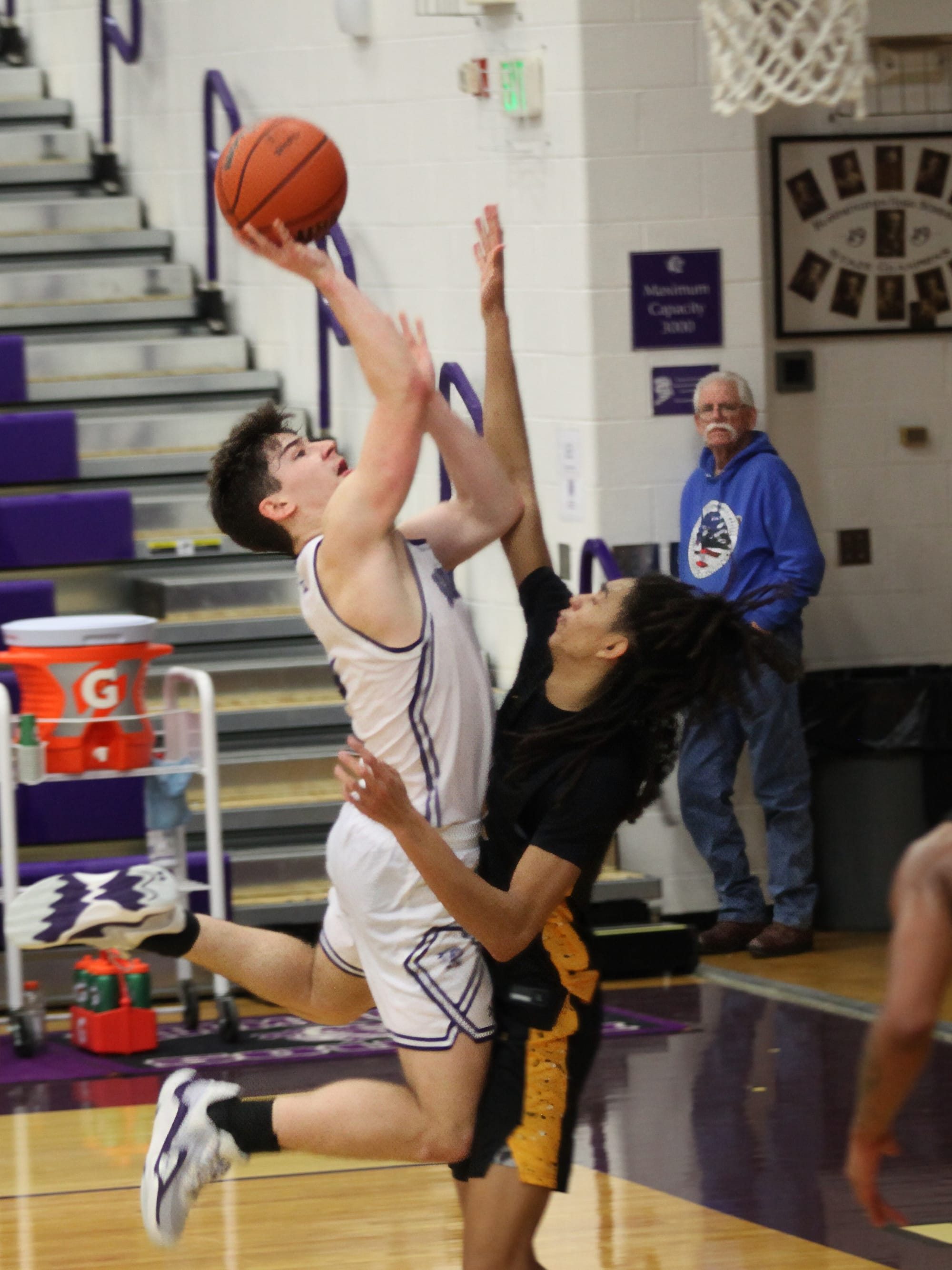 Left: Jack Clark (3) takes the ball strong to the basket for the Panthers against the Oriole defender in Saturday's evening game. Right: Duncan Combs (34) squares off for the Panthers against Terry Miles (24) in the first game of the tournament. (Dave Askins, Dec. 27,. 2025)