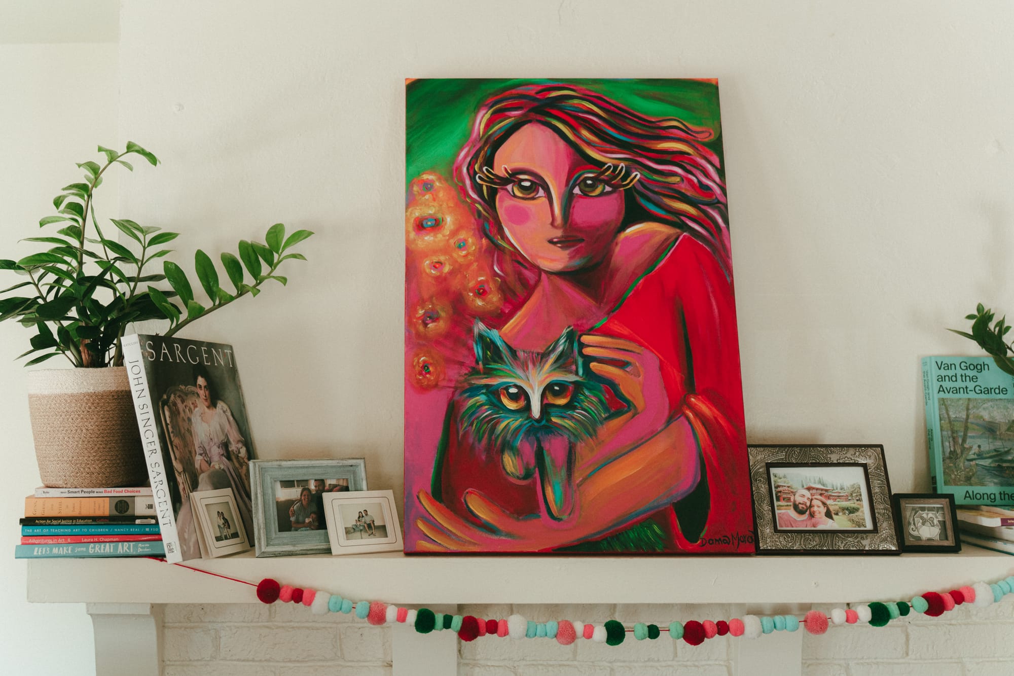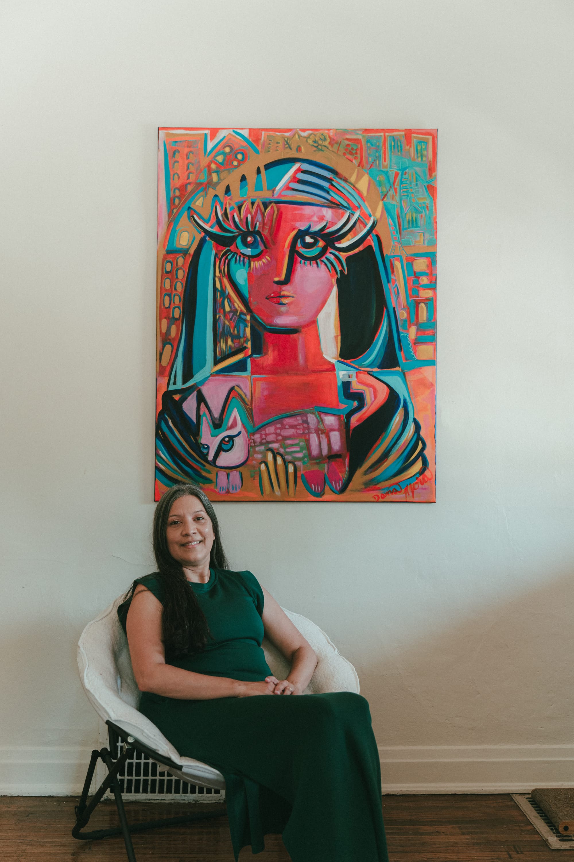 “[My art] is for empowering women,” Mora told The B Square. “The cat lady stereotypes—it’s sad, old, alone—and I’m trying to change that narrative. Because usually ‘cat lady’ is ... misogynistic.” Instead, she paints women who she described as powerful, happy, vibrant, and whole. “That’s how I paint her and how I want her to be seen,” she wrote about the show.