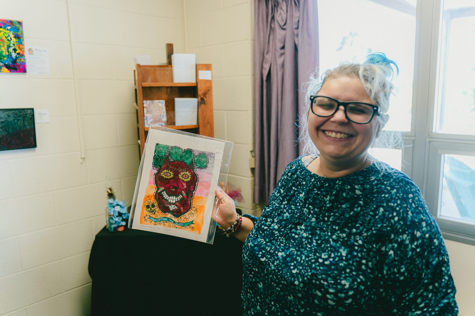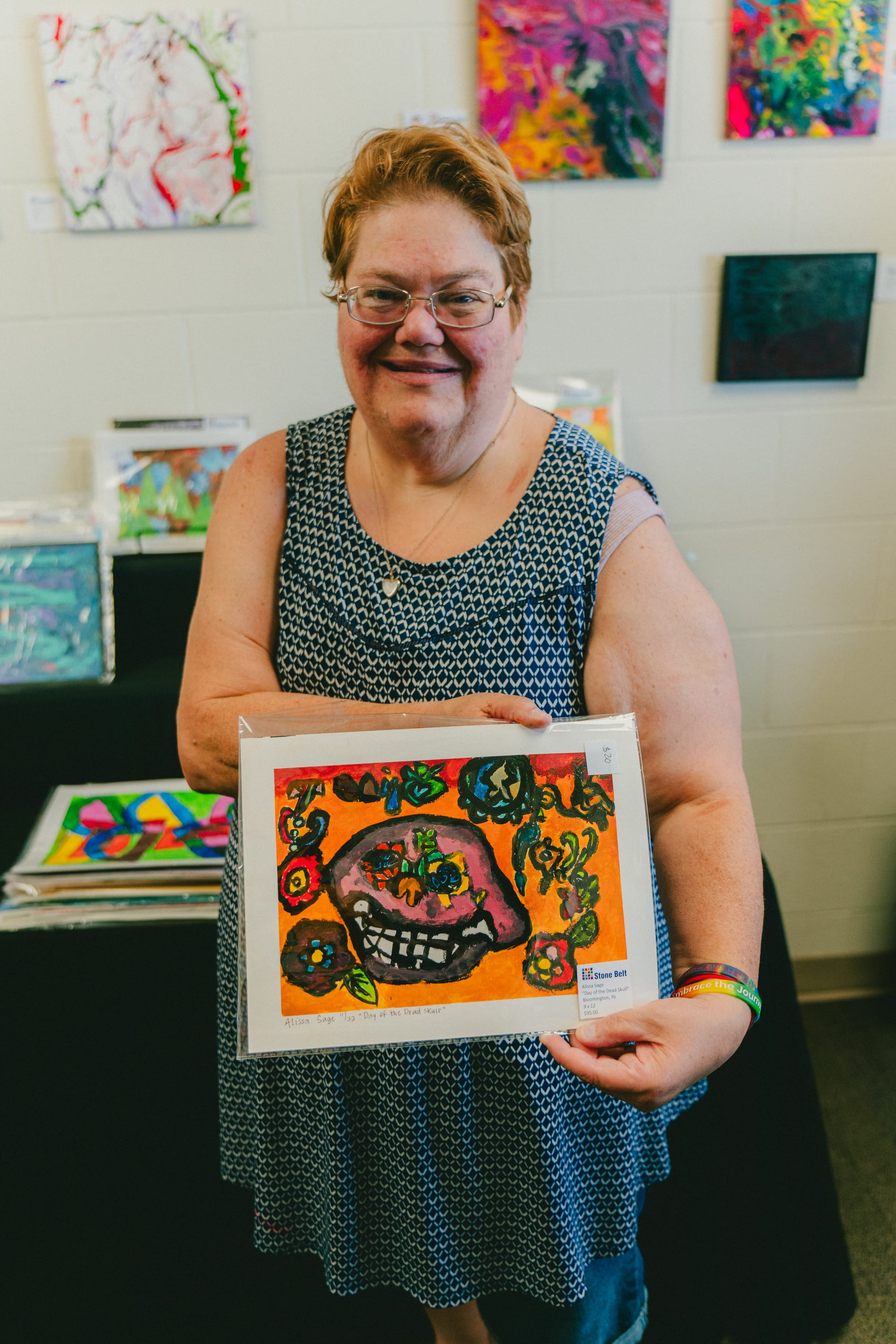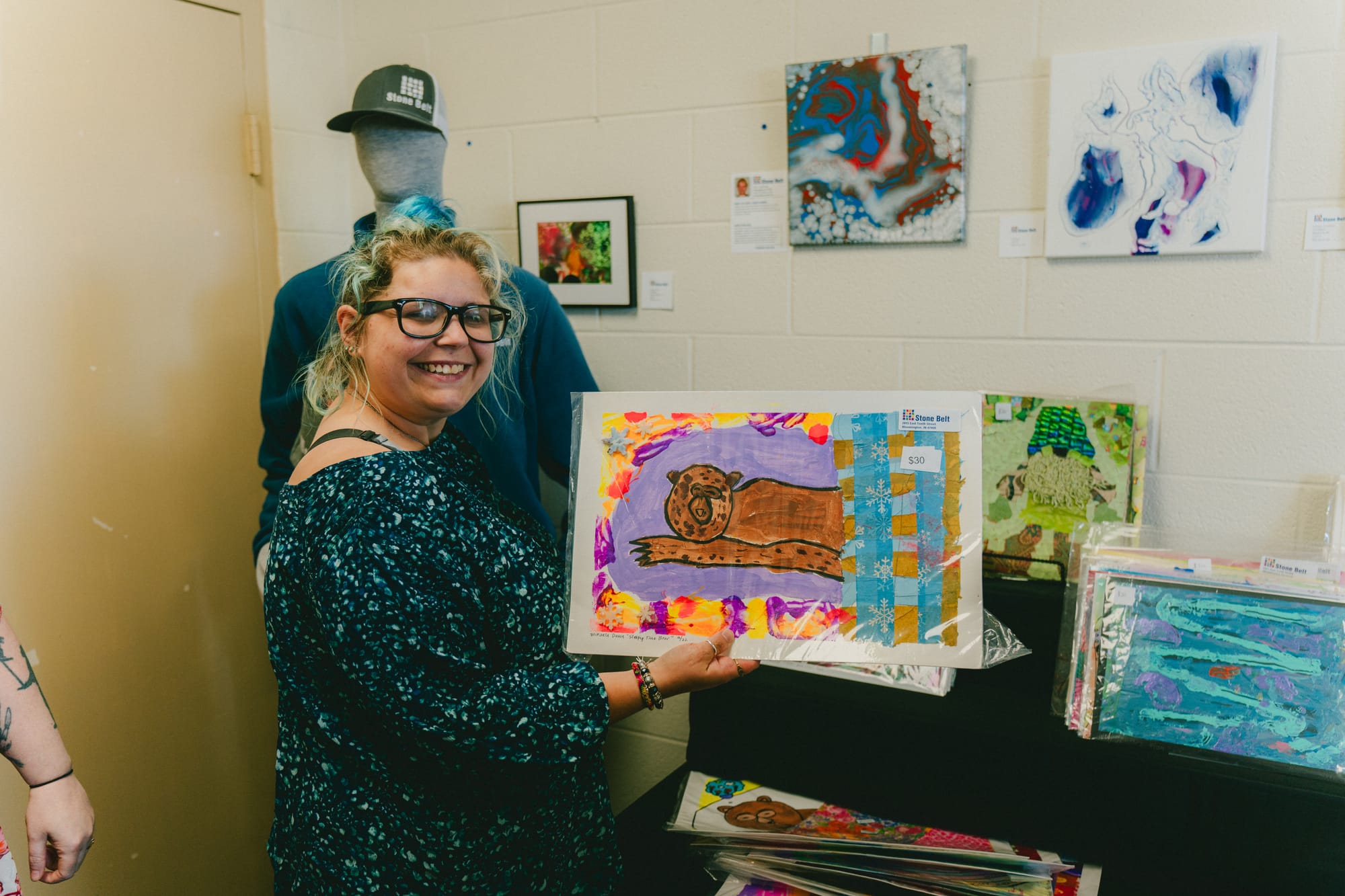 Stone Belt client and board member Mikaela Coppedge has a piece at the gallery called “Confident as a Lion.” It’s a watercolor painting of a lion with a pink and blue background. Jackson said Coppedge includes flowers in most of her work: “Botanical, bursting things that represent nature and growth” play an important role in her art, Jackson said.
