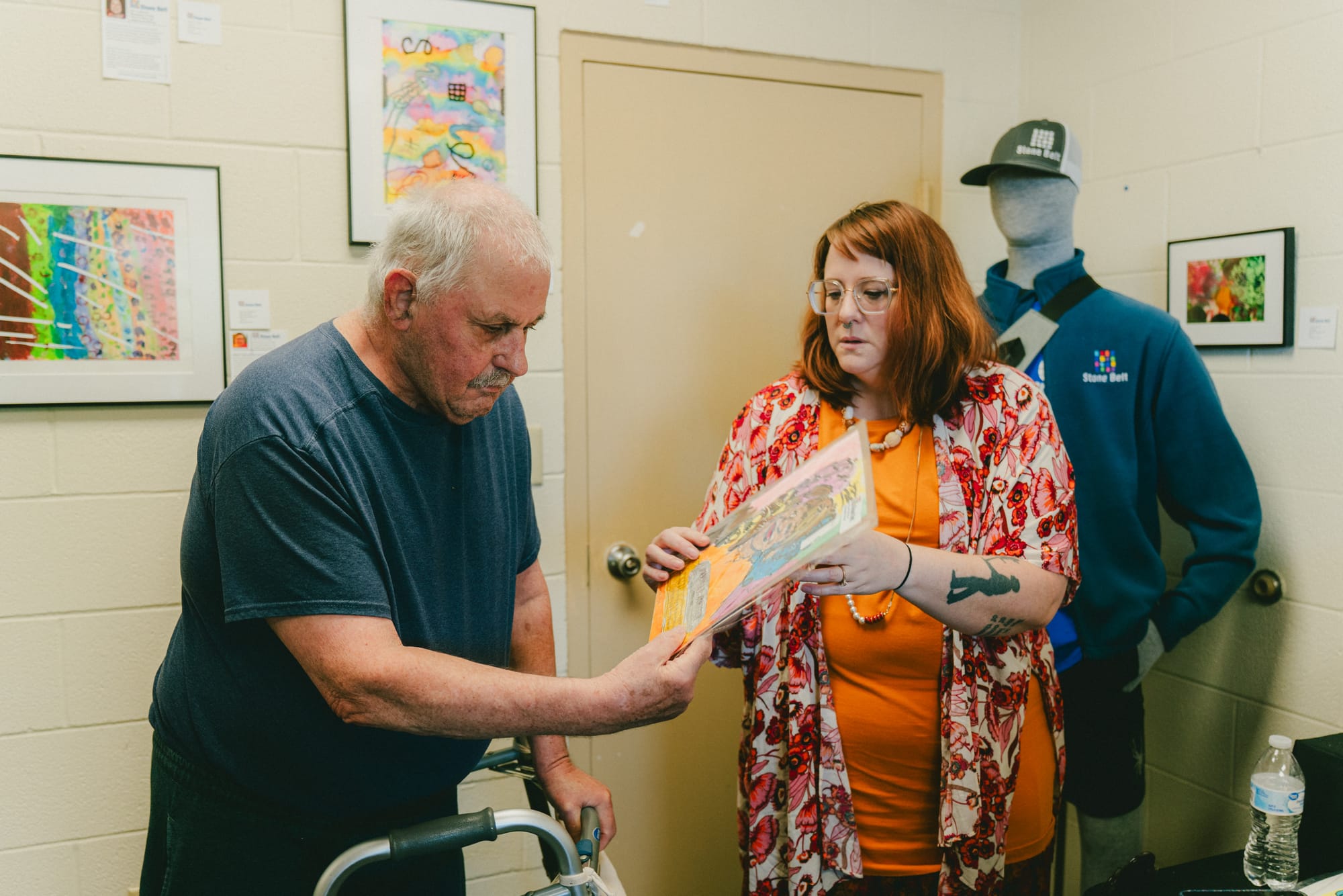 Left: Stone Belt artist Don Robinson looks at his artwork with art instructor Tiffany Jackson. Right: Don Robinson's work will be on display at Bloomingfoods Gallery B for the August Gallery Walk. (Kelton O'Connell, July 30, 2025)