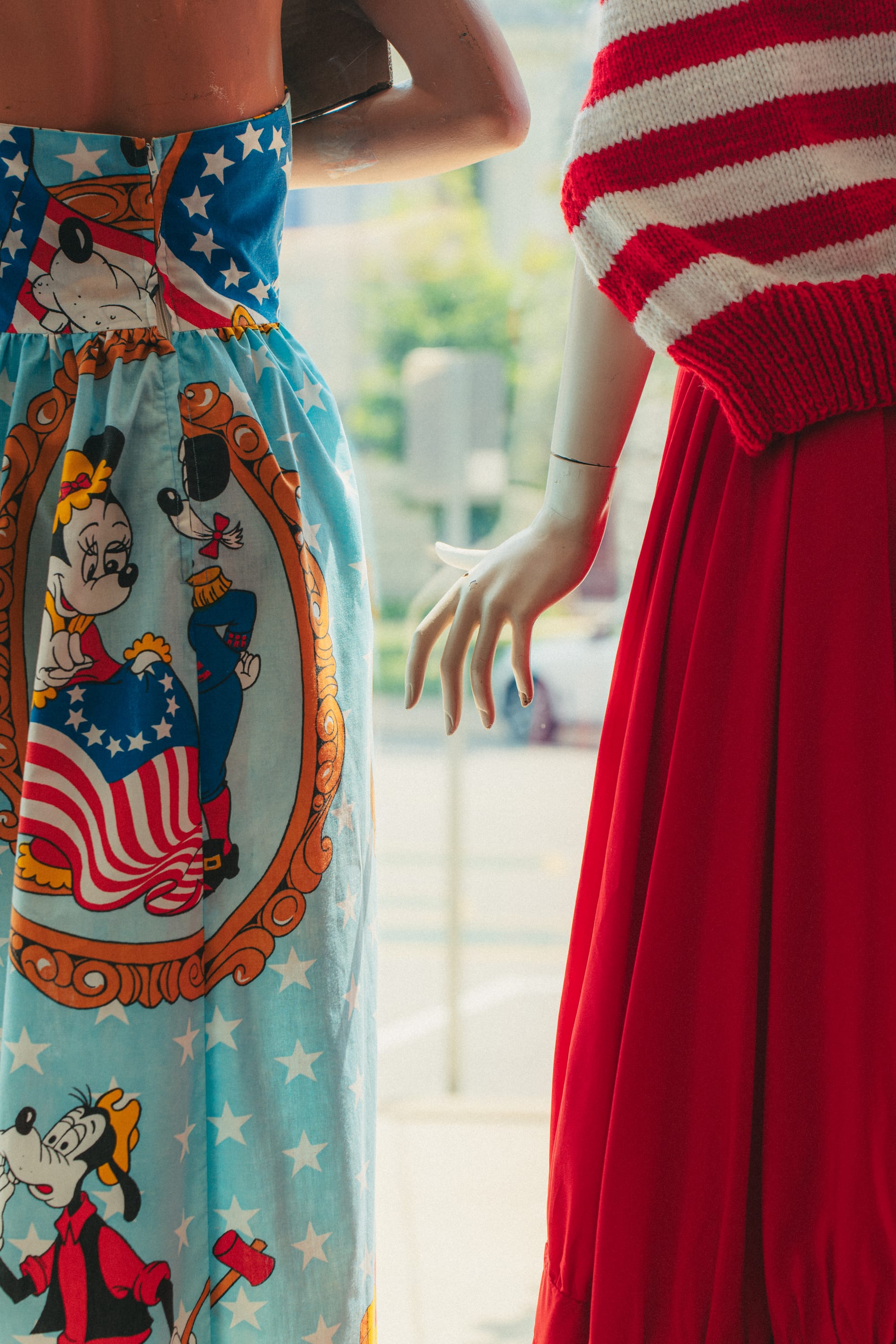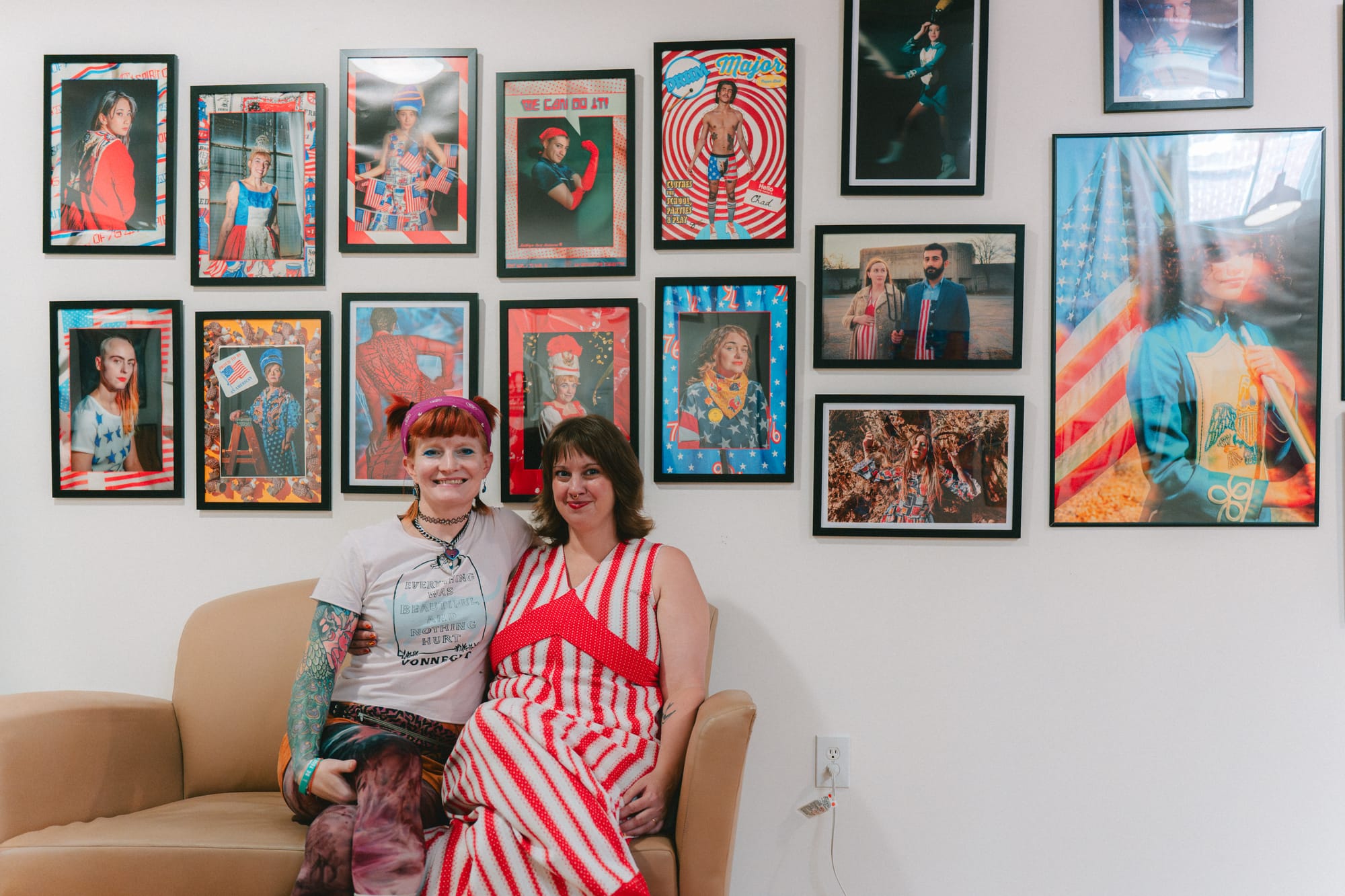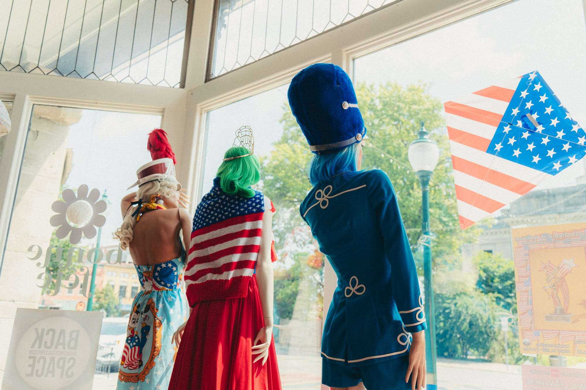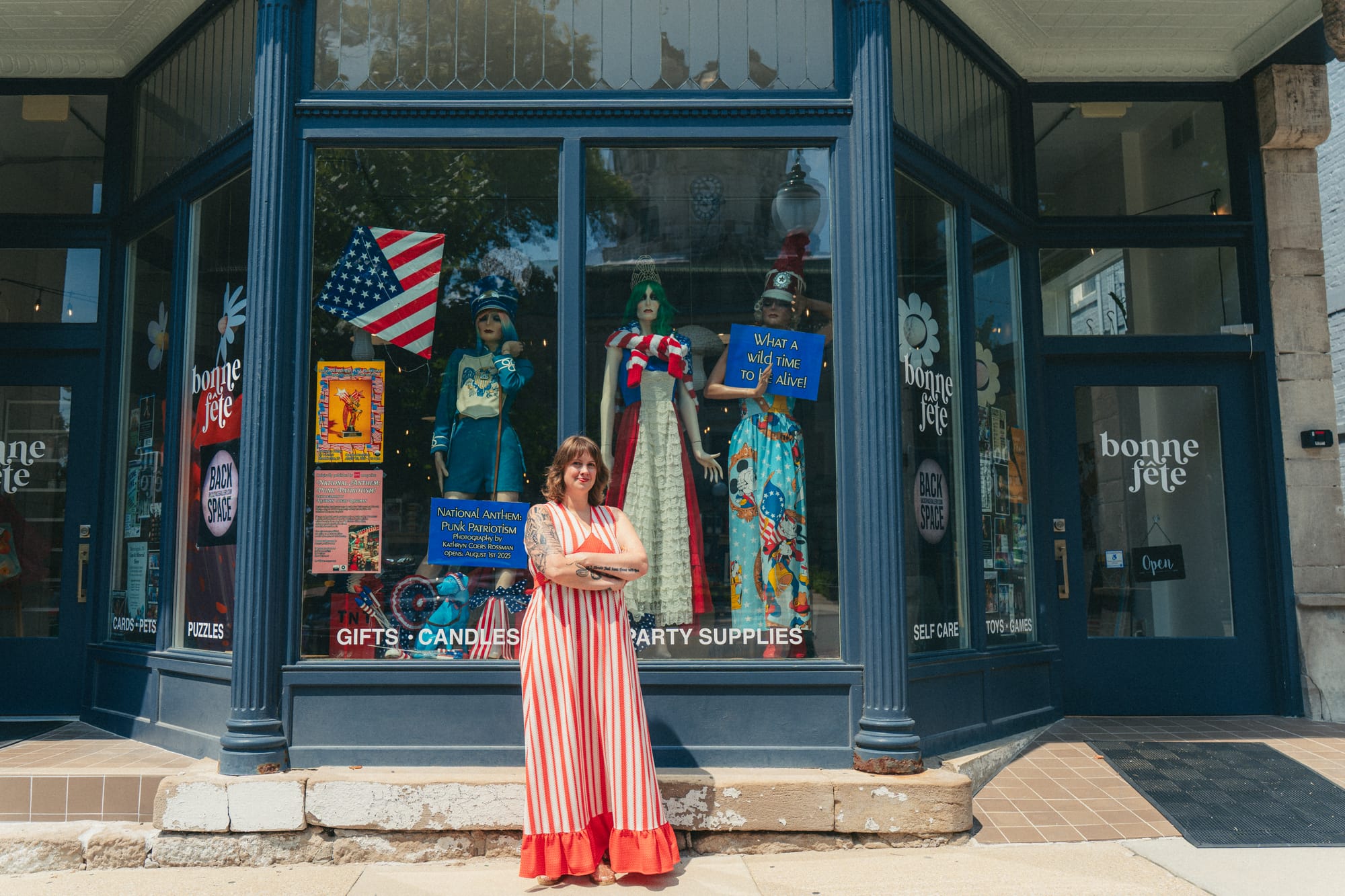 Left: Curator Sarah “Pixie” Conway and photographer Kathryn Coers Rossman in the new “National Anthem: Punk Patriotism” show at the Backspace Gallery. Right: Kathryn Coers Rossman in front of the window display that features vintage Bicentennial clothing. The mannequins were moved to the gallery for the opening last week. (Kelton O'Connell, July 30, 2025)
