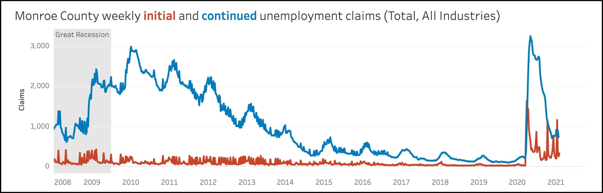 Out of that labor force of 69,205, in late 2020, 2,315 people were unemployed in Monroe County. That made for a 3.3-percent unemployment rate. It’s 25 percent higher than last year, Rogers said. “We’re in one of the highest unemployment scenarios that we’ve been in the county since the Great Recession,” Rogers said.
