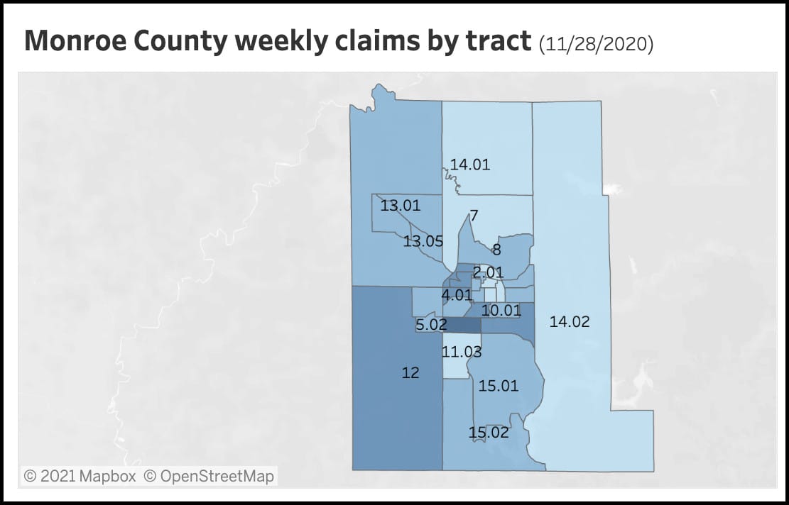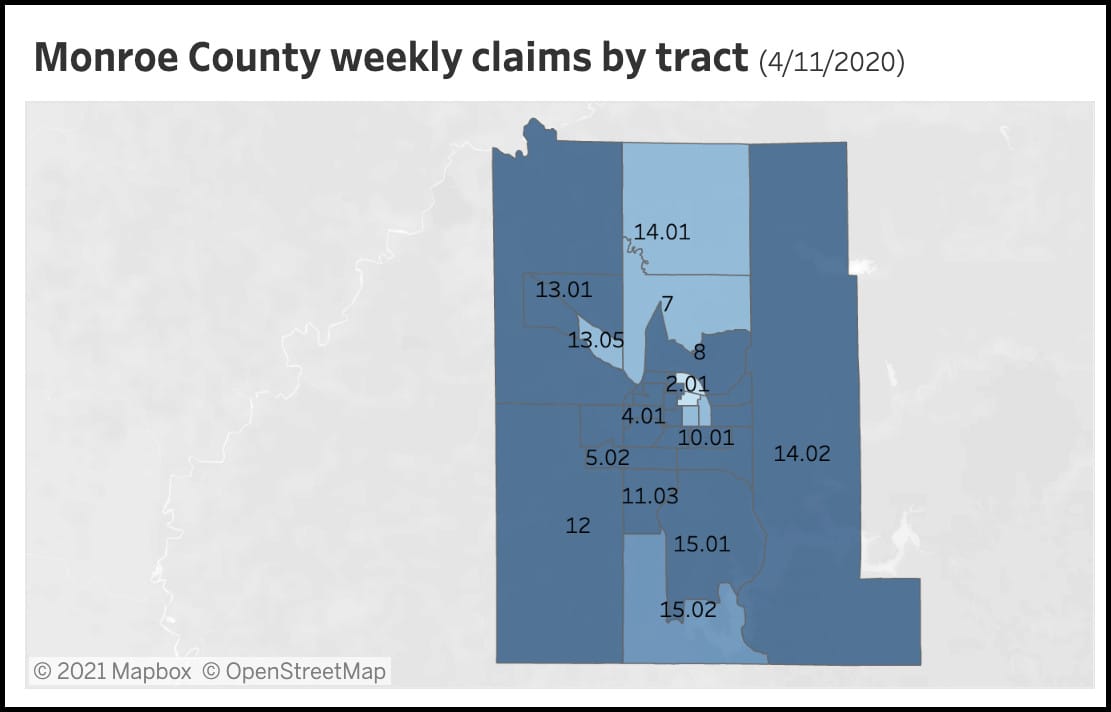 Rogers provided some geographic data for unemployment claims that showed the initial impact was significant across the county, with some exceptions inside Bloomington. Rogers chalked that up to the stability of Indiana University and the amount of remote working that was done.