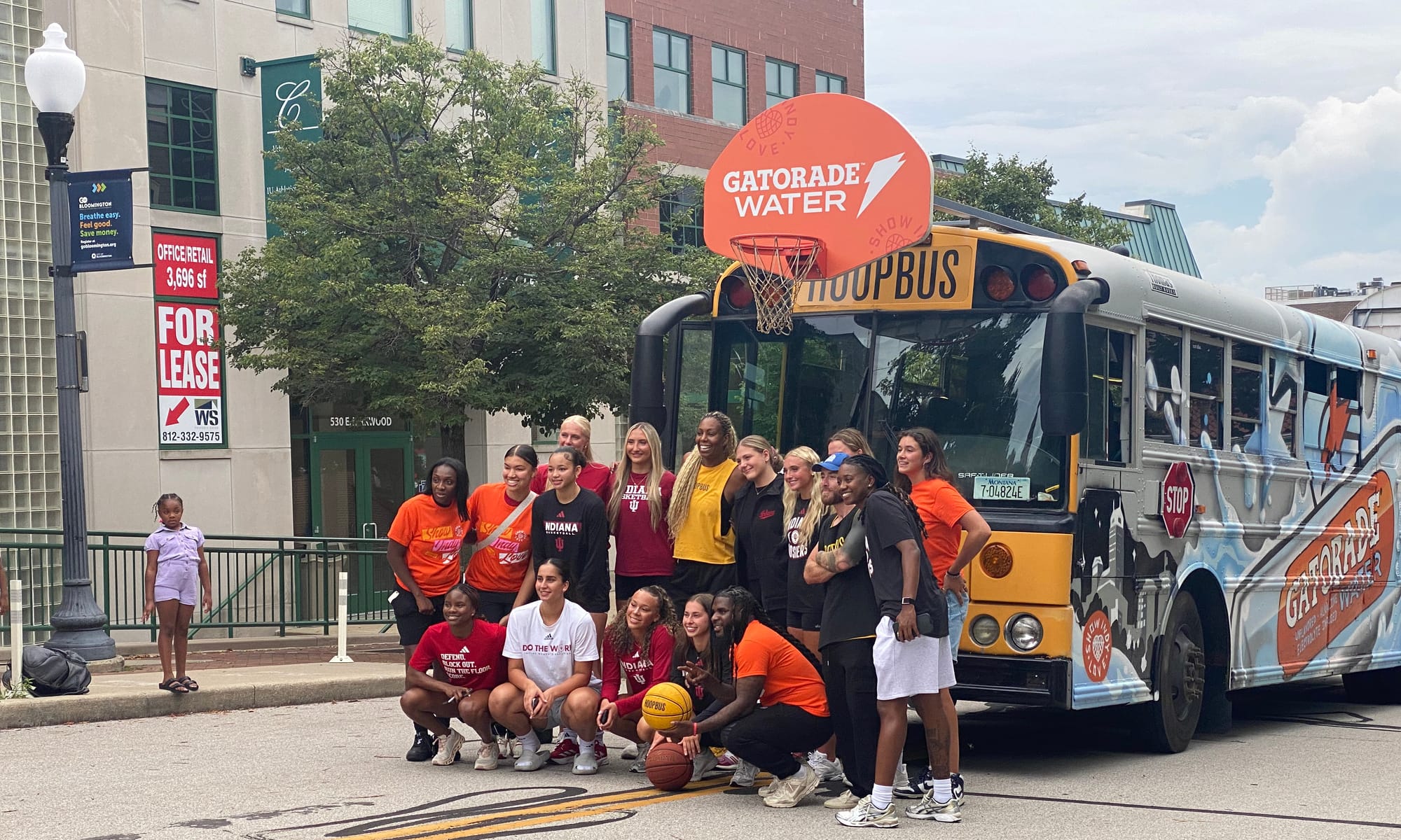 The social media-famous Hoopbus brought a yellow school bus and a chance to shoot baskets with IU women’s basketball players to Bloomington on Tuesday evening. The event was part of Hoopbus’s tour around Indiana to drum up enthusiasm before the WNBA All-Star Game in Indianapolis on Saturday.