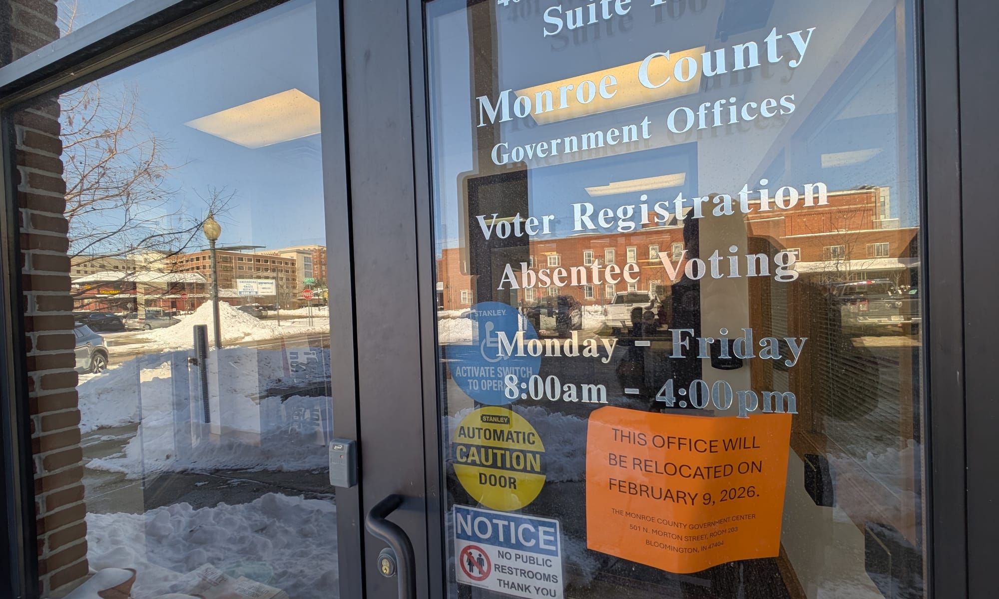 The sign on the door of Election Central says the office will be relocated to the Monroe County government building at North Showers, starting Feb. 9, 2026.