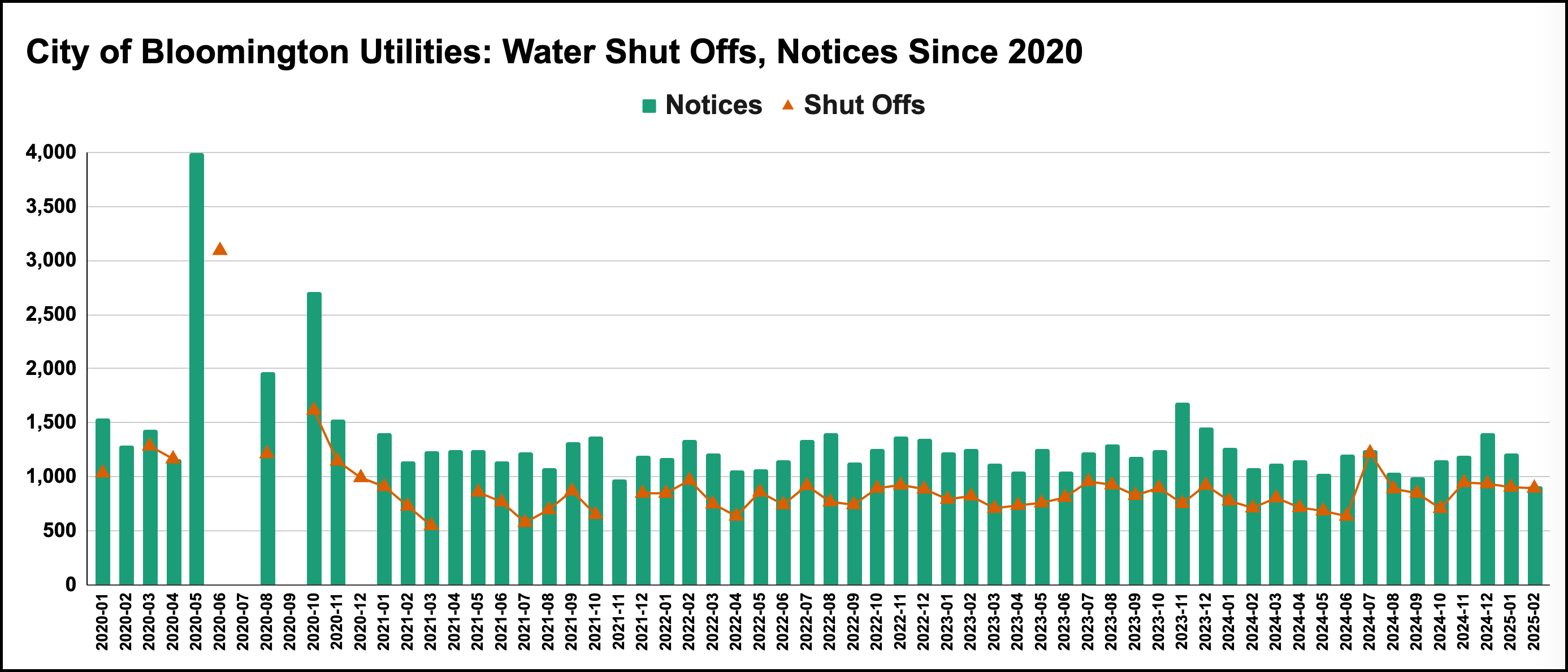 CBU water shut off notices. Based on a report from a reader who had their water shut off due to nonpayment, I'm taking a look at the numbers and the policies used by City of Bloomington Utilities (CBU) to shut off a person's water. There's same gaps in the data in the early months from this set, due in part to circumstances of the pandemic. But here's an initial chart. (For any given month, there's around 25,000 total customers.