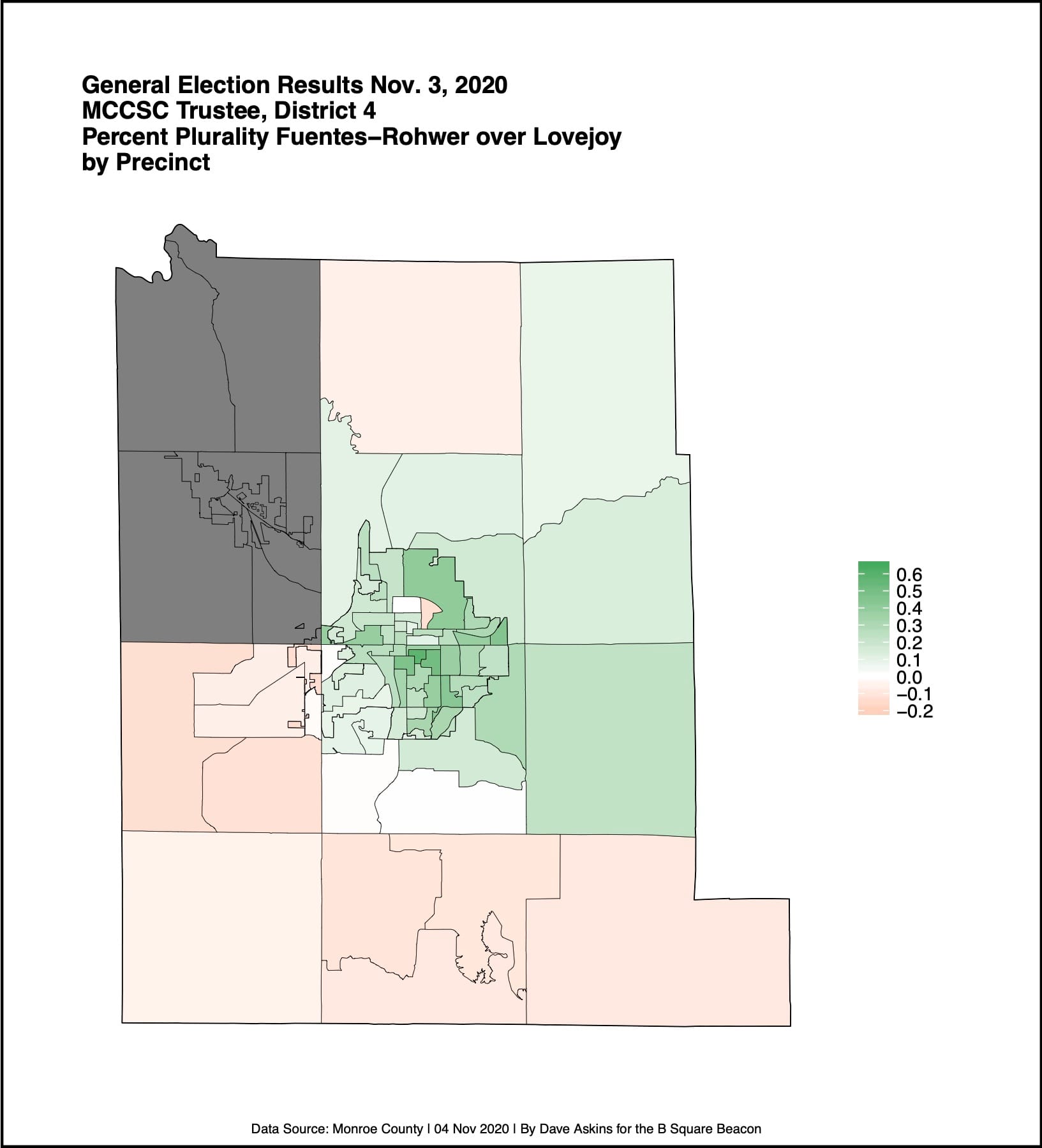 The race for the District 4 seat was closer than for District 2 or District 6. Fuentes-Rowher received 20,243 votes (58.4 percent) compared to 14,414 (41.6 percent) for Lovejoy. In 15 precincts, Lovejoy outpointed Fuentes-Rowher. If the outcome had been determined based just on Election Day voting, Lovejoy would have prevailed with 6,553 votes (51.2 percent) to Fuentes-Rowher’s 6,255 (48.8 percent).