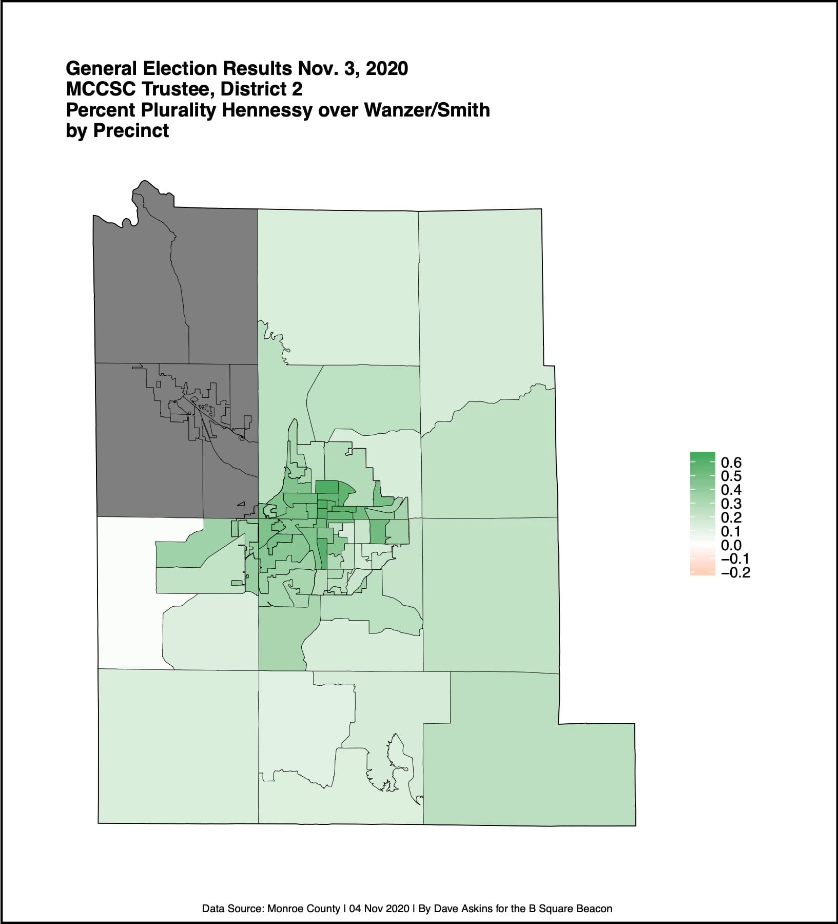 The school corporation’s land area is divided into districts to ensure some geographic diversity of representation by trustees. But residents of the whole area vote on each trustee. Hennessey’s win was based on support across the MCCSC geographic area.