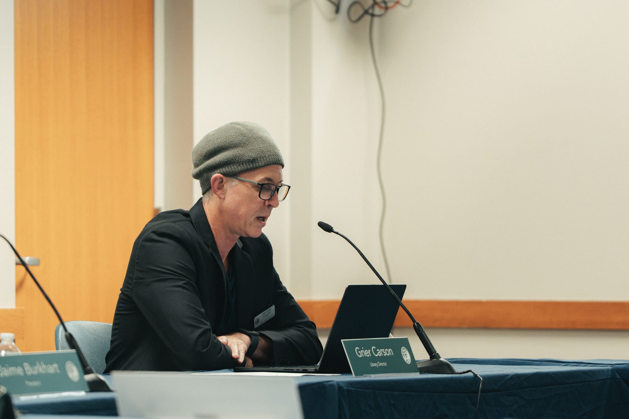 The Monroe County Public Library board of trustees at its regular meeting on Wednesday. Right: Library director Grier Carson describes proposed changes to downtown library hours before the board voted to approve the adjustments. (Kelton O'Connell, Aug. 20, 2025)