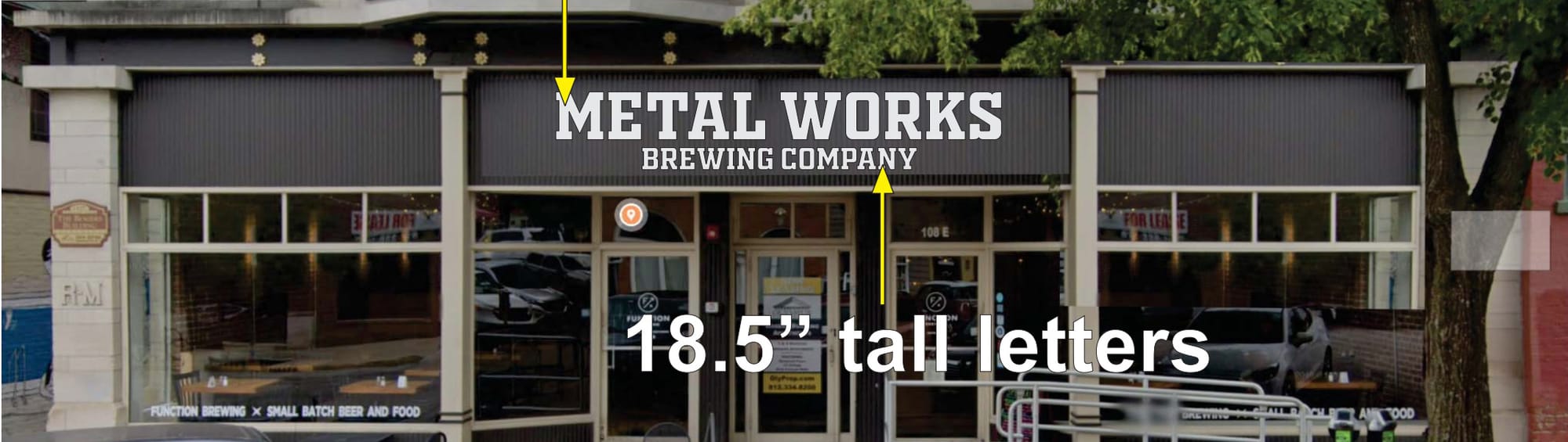 New individual aluminum block letters, lit with LEDs will soon replace the temporary vinyl banner sign on the facade of Metal Works Brewing Company in downtown Bloomington.