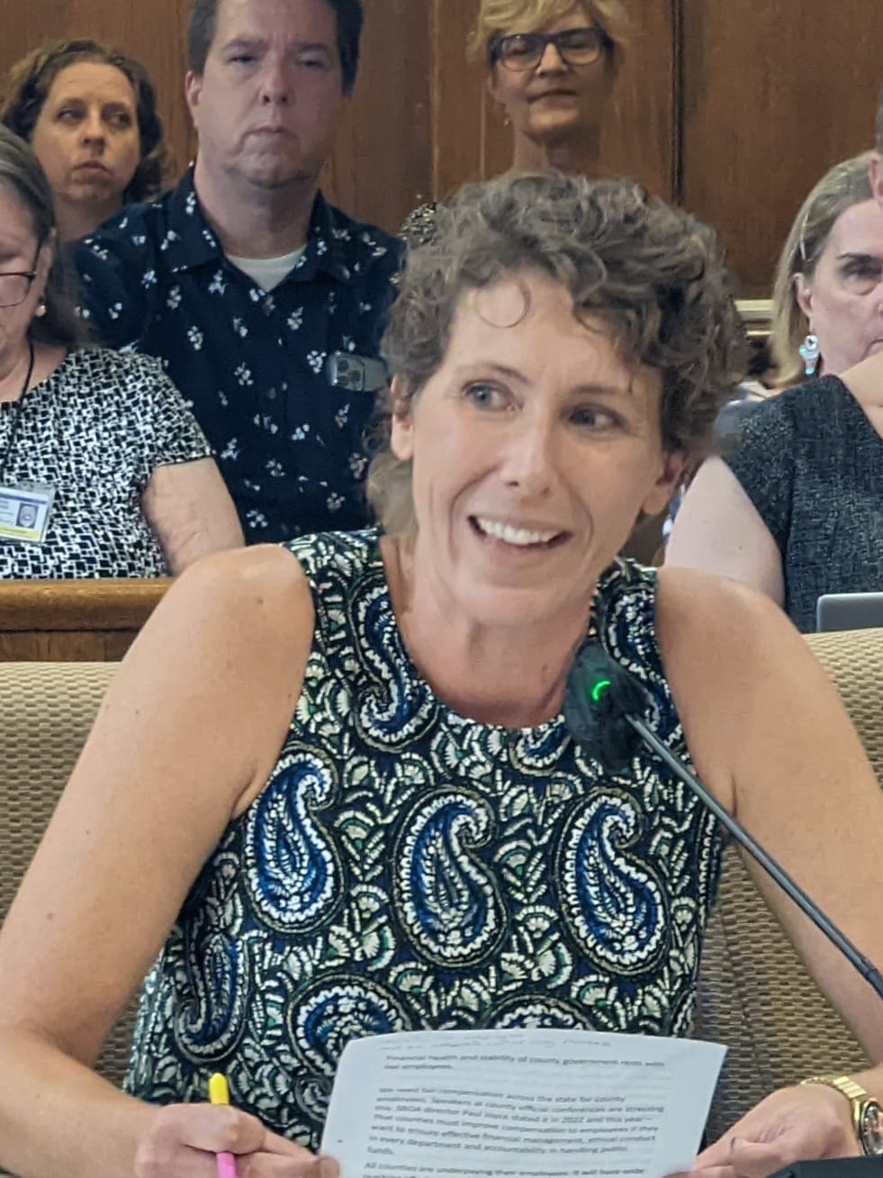 County treasurer Jessica McClellan delivered remarks from the public mic in support of more pay for county employees. She received a big round of applause from the crowd of county workers that had gathered in the Nat U. Hill room at the county courthouse on Tuesday, to watch councilors discuss possible pay increases.