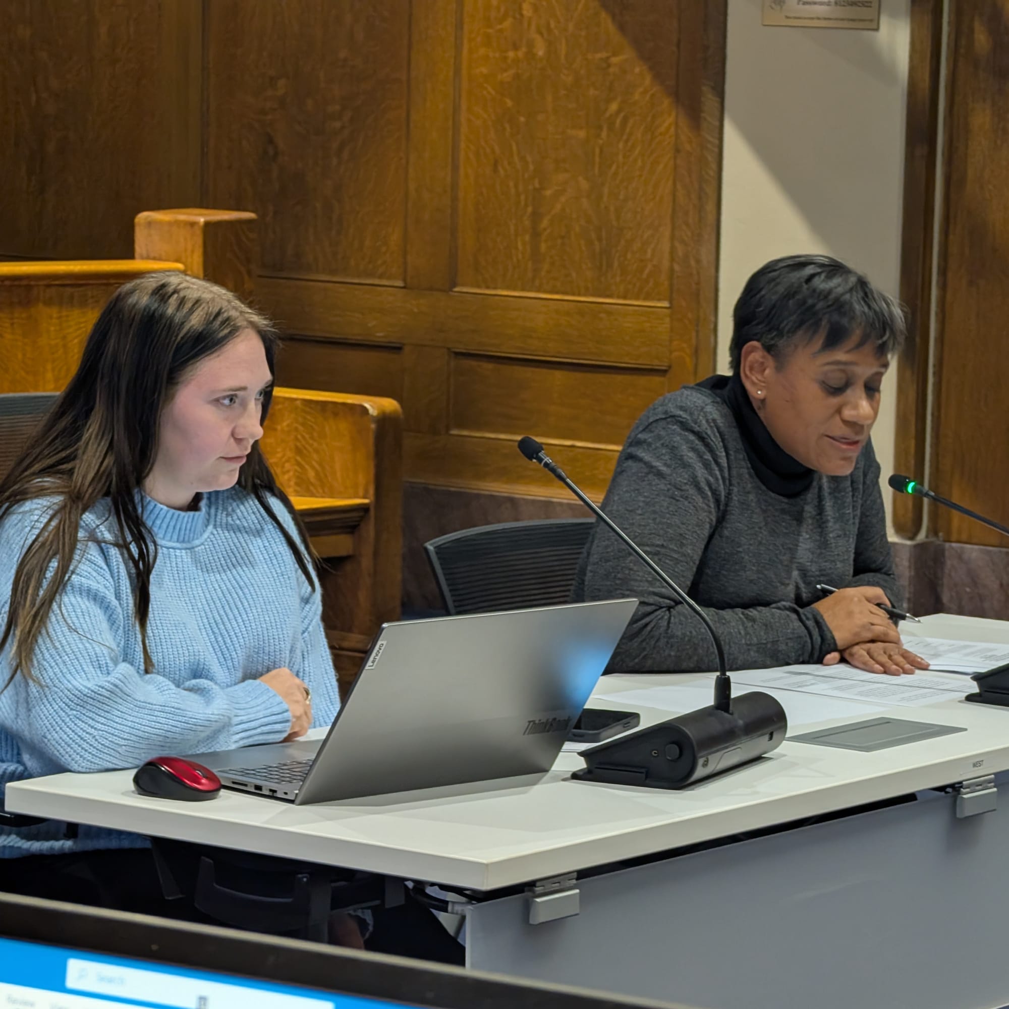 Left: From left Monroe County election supervisor Kylie Farris and Monroe County clerk Nicole Browne Right: Monroe County councilors from left: Marty Hawk, David Henry, Jennifer Crossley, Trent Deckard, Kate Wiltz, Liz Feitl. (Dave Askins, Feb. 11, 2026)